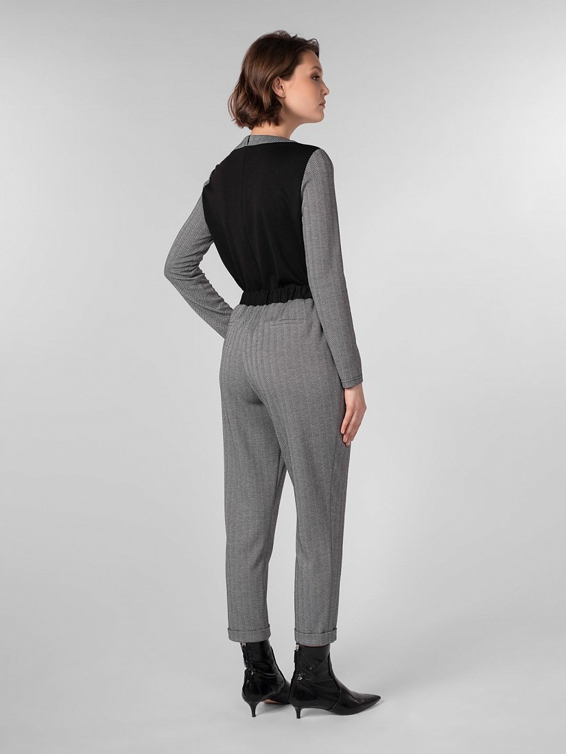 Брюки из трикотажного полотна зауженного к низу силуэта на притачном поясе с кулиской и завязками. Спереди боковые карманы, по низу брюк манжеты. Сзади карманы листочки.