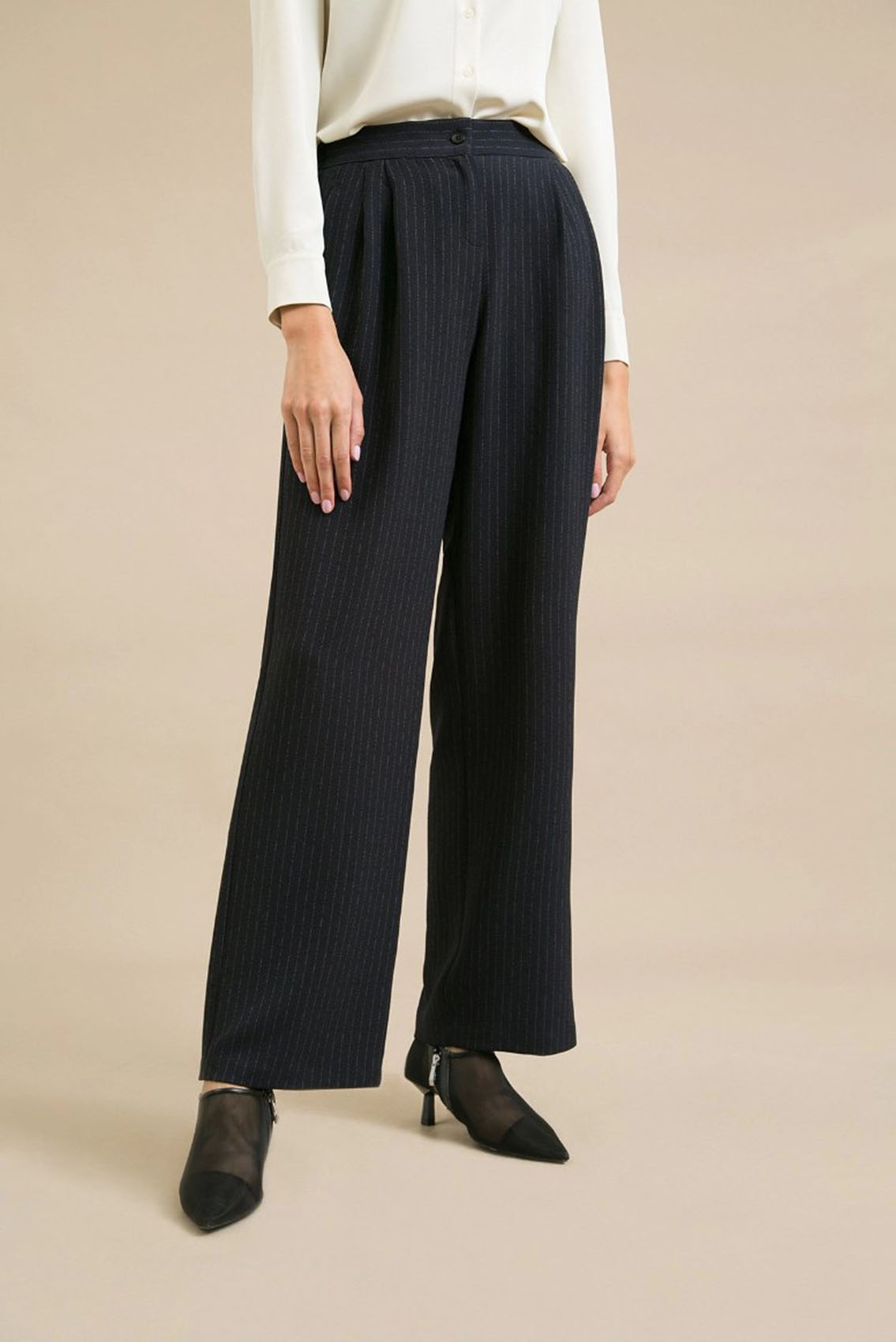 Темно-синие брюки в полоску. Модель свободного кроя, имеет высокую посадку, притачной пояс, боковые вертикальные карманы. Спереди расположен гульфик классической формы, застегивается на потайную молнию и пуговицу. У карманов штанины драпированы складками. Элегантная модель для создания делового образа.