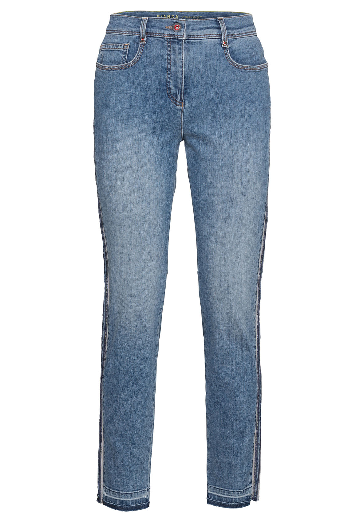Данная модель джинсов создает оптимальную посадку благодаря прилеганию по линии ног. Модные потертости, полосы по бокам в спортивном стиле. Открытый нижний срез с бахромой придает брюкам демократичный вид. Неважно, спортивный или шикарный образ вы создаете, эти джинсы станут вашей модной изюминкой сезона. • джинсы с эффектом потертости и бахромой по низу • эластичная хлопковая джинсовая ткань • 5 карманов • яркие полосы по бокам • силуэт slim, средняя посадка • длина около 74 см