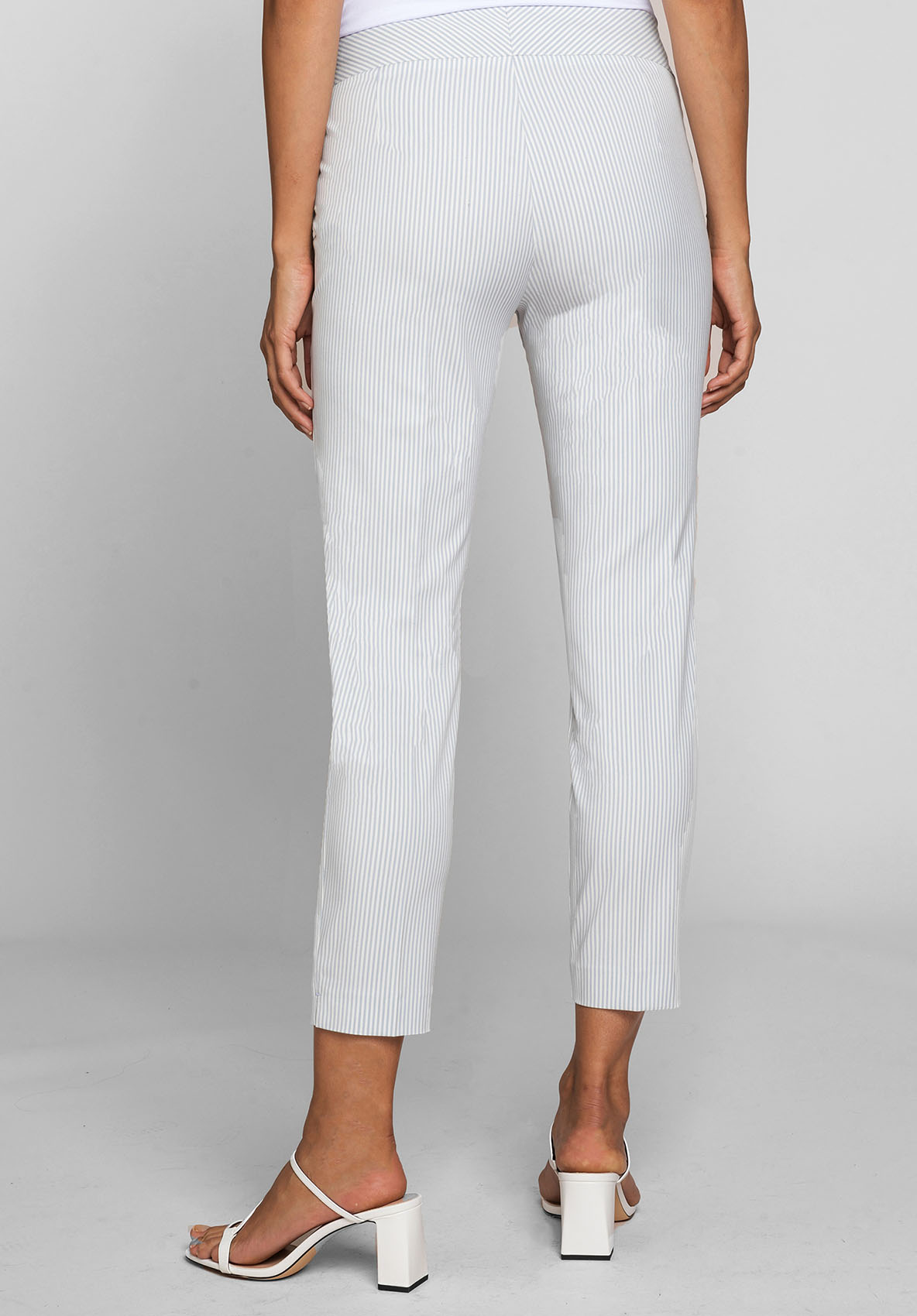 Эластичные брюки Siena с трендовым принтом в полоску. Брюки отлично подходят для стильного образа. Эластичный материал очень удобен в ношении. Данная модель имеет силуэт slim, среднюю посадку, длину 7/8, высокий пояс со скрытой застежкой и небольшой карман под поясом. Брюки станут идеальной модной парой как для делового, так и для повседневного образа. • брюки с принтом в полоску • высококачественная смесь вискозы и эластана • застежка-молния, небольшие разрезы по бокам • средняя посадка, силуэт slim • укороченные брюки 7/8, длина около 68 см