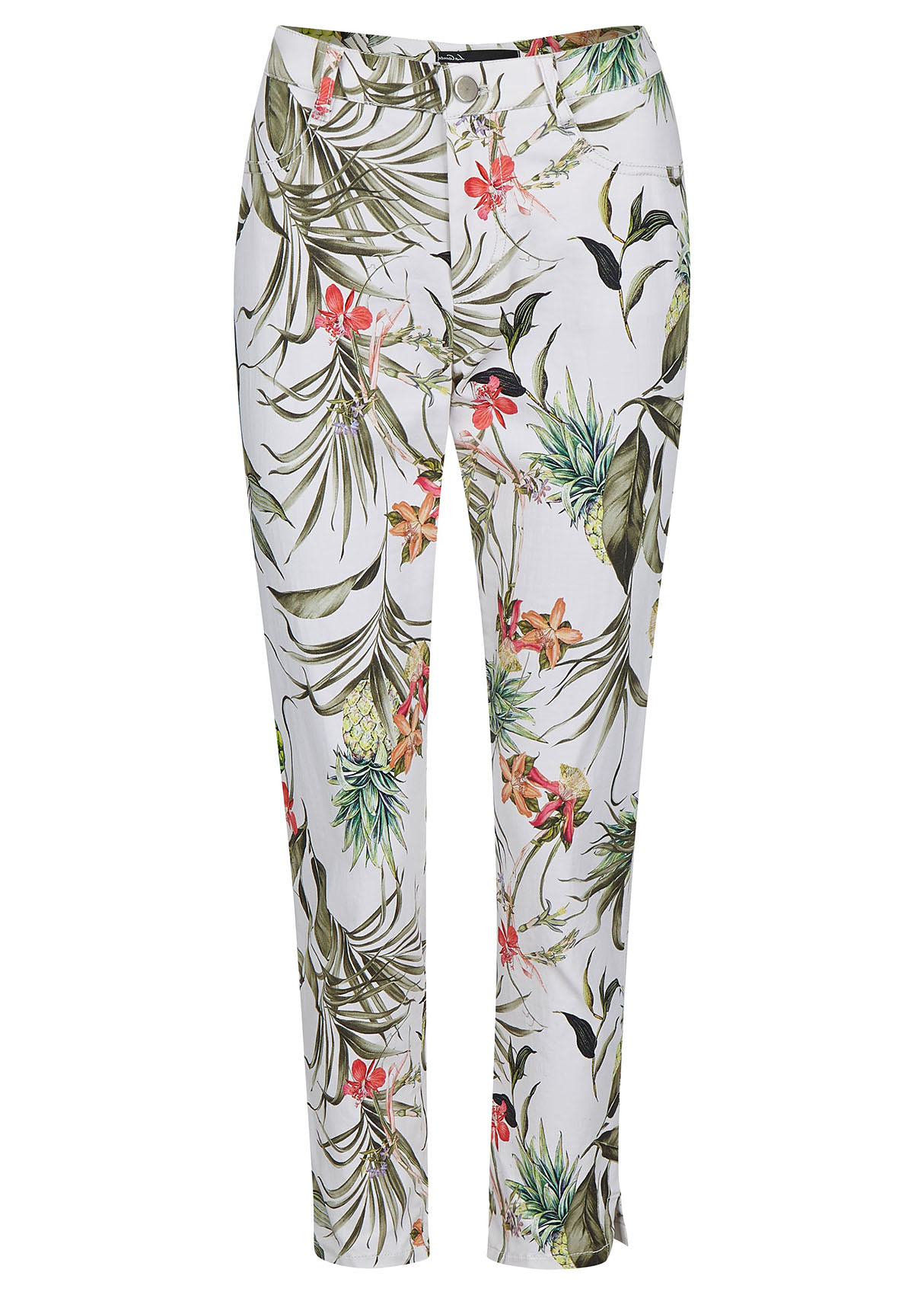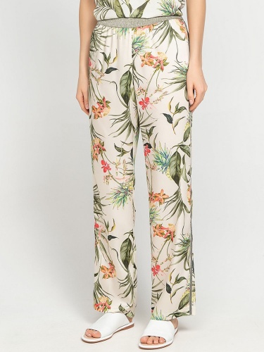 Широкие прямые брюки с трендовым тропическим принтом. Модный свободный силуэт. Эластичная лента на поясе. Без карманов. Декоративная лента по бокам. Приятный к телу материал из смеси хлопка и эластана.