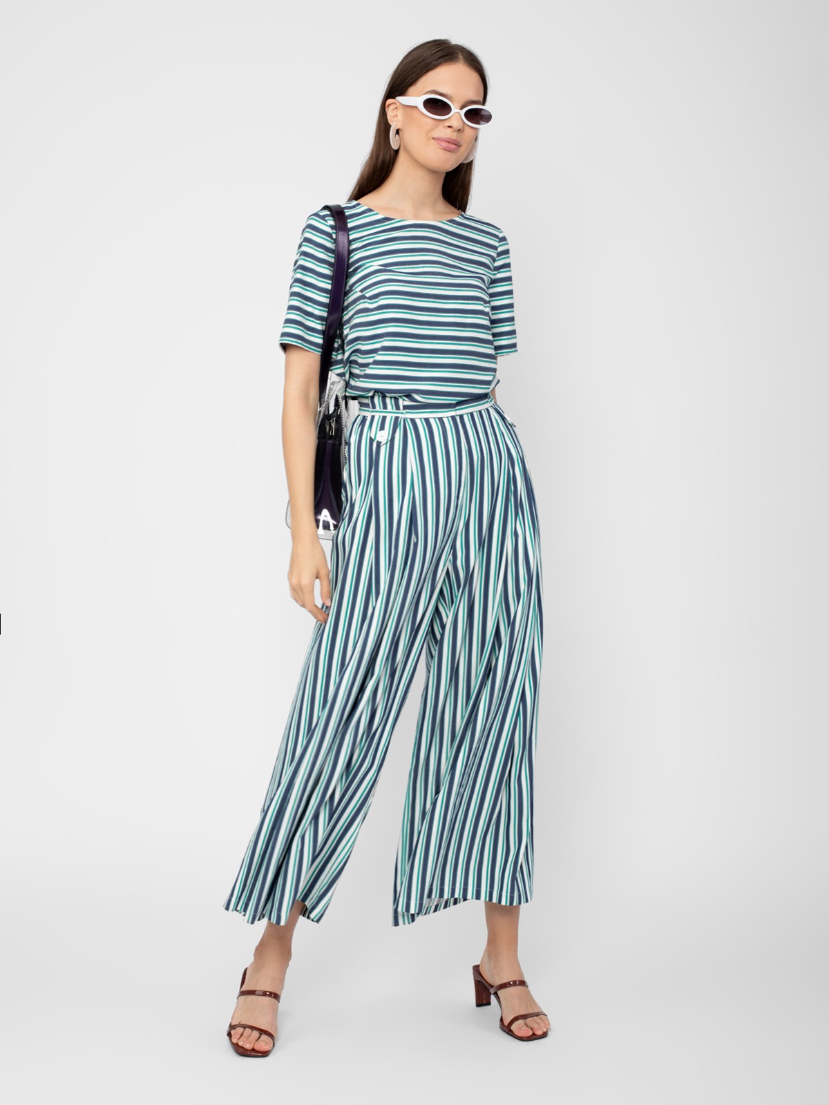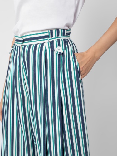 Брюки в полоску прямого широкого силуэта на притачном поясе с широкими шлевками и с боковыми карманами. Застежка спереди на молнию.