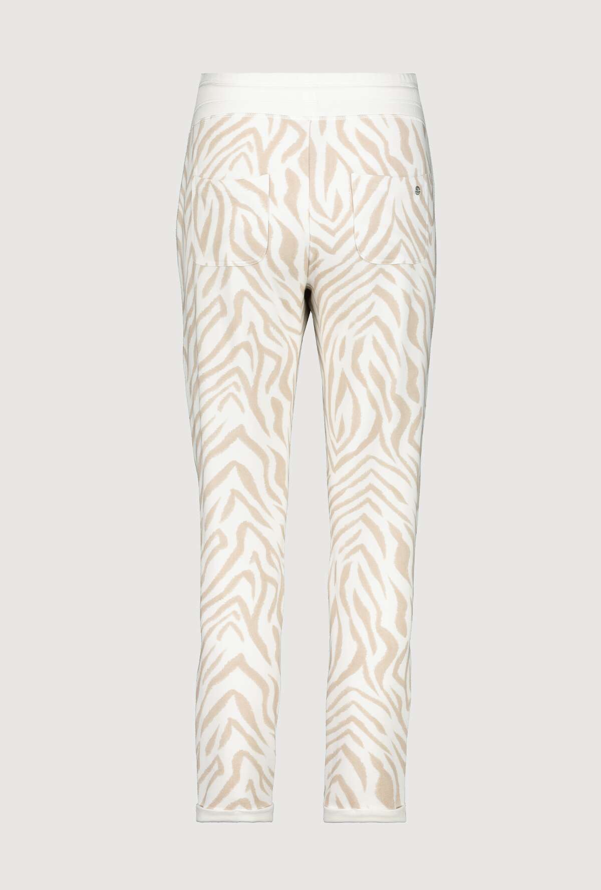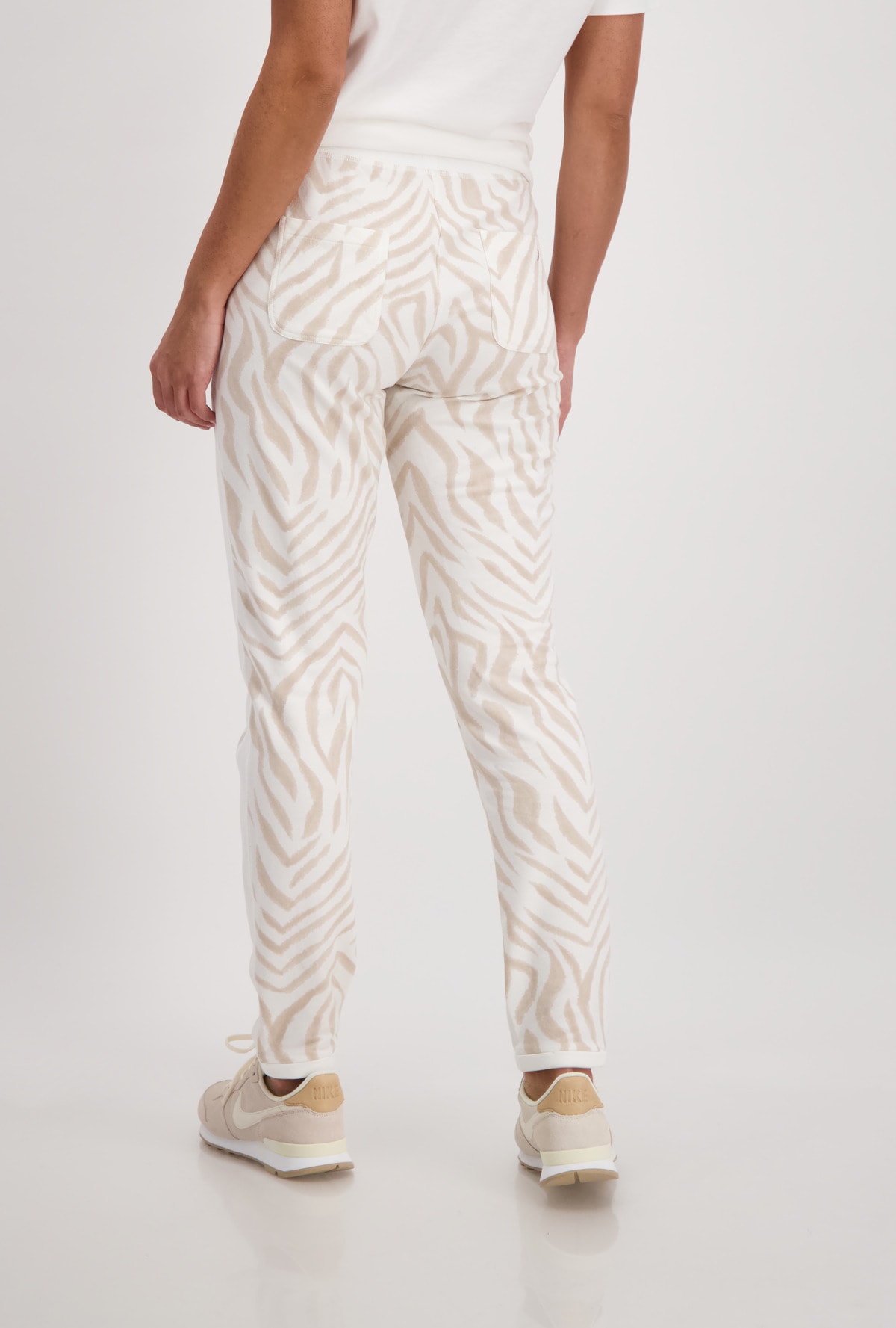На сайте указаны Российские размеры. Спортивные джоггеры Monari с животным принтом. Сплошной рисунок под зебру дополняется однотонным поясом с блестящими оверлочными швами, однотонной тканевой вставкой с блестящими оверлочными швами по бокам и подвернутыми однотонными штанинами. Боковые карманы и накладные карманы на ягодицах завершают вид спортивных штанов с нормальной посадкой. Параметры модели: 42 размер, рост 179 см
