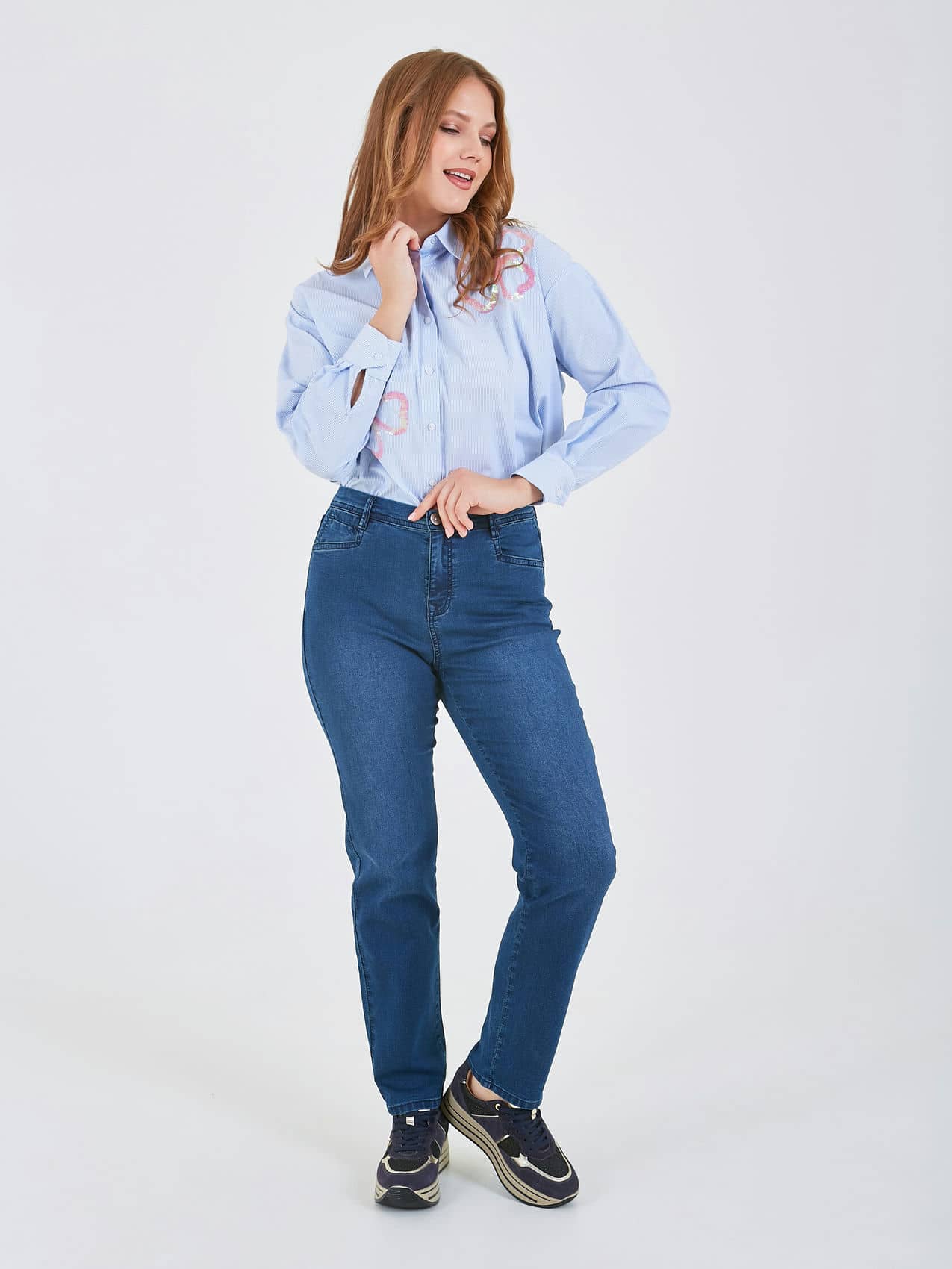 Классические джинсы — универсальный элемент гардероба из высококачественного денима с прямым силуэтом, идеально сочетающийся с любой одеждой для создания стильных образов. Коллекция Весна-Лето 2025. Капсула "Самарканд". Параметры модели: 95-64-101, рост 175, размер 44-46