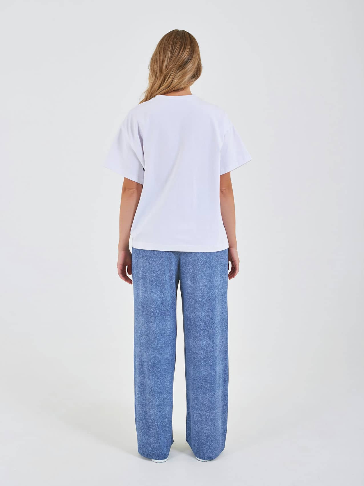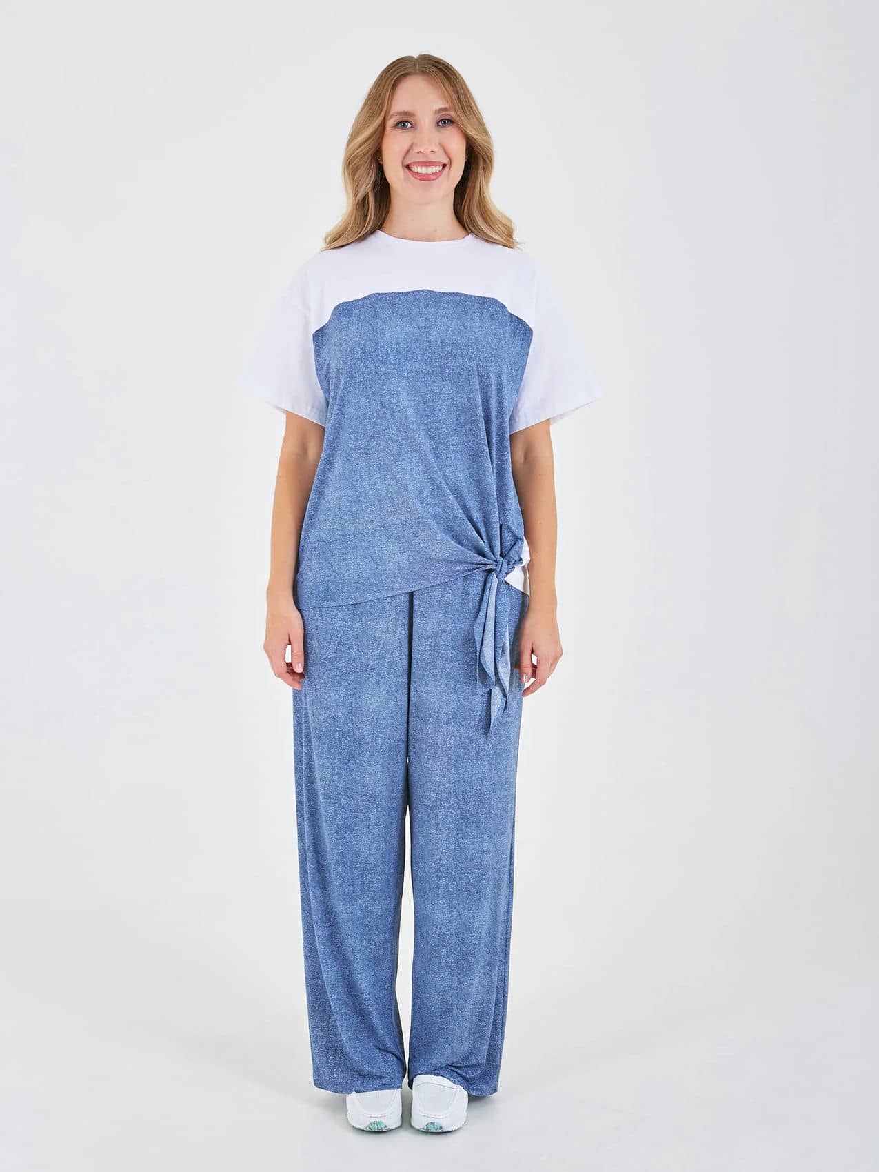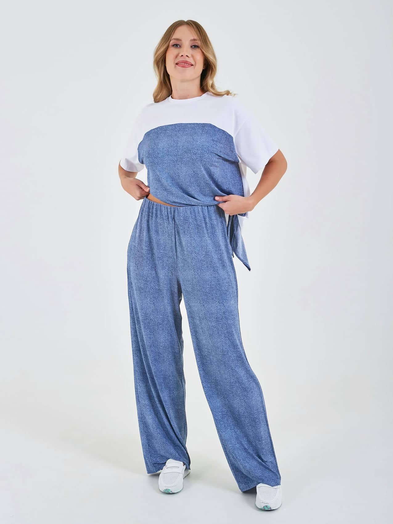 Брюки выполнены из мягкого материала и имеют свободный крой, что обеспечивает комфорт при носке. Они представлены в синих тонах и могут легко сочетаться с различной верхней одеждой, создавая стильный и расслабленный образ. Коллекция Весна-Лето 2025. Капсула "Сен-Тропе". Параметры модели: 89-70-92, рост 167, размер 44-46