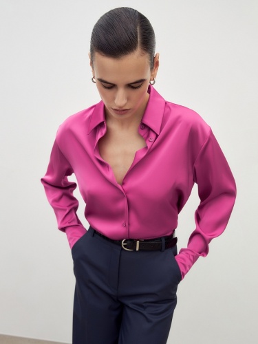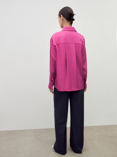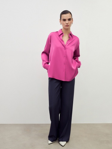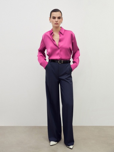 Прямые брюки свободного силуэта из костюмной вискозной ткани в блогородном темно-синем цвете. Имеют два функциональных кармана по бокам и два прорезных кармана сзади. Брюки идеально сочетаются с жакетом из одной ткани.