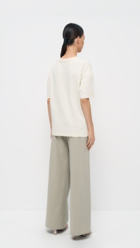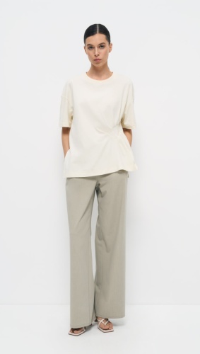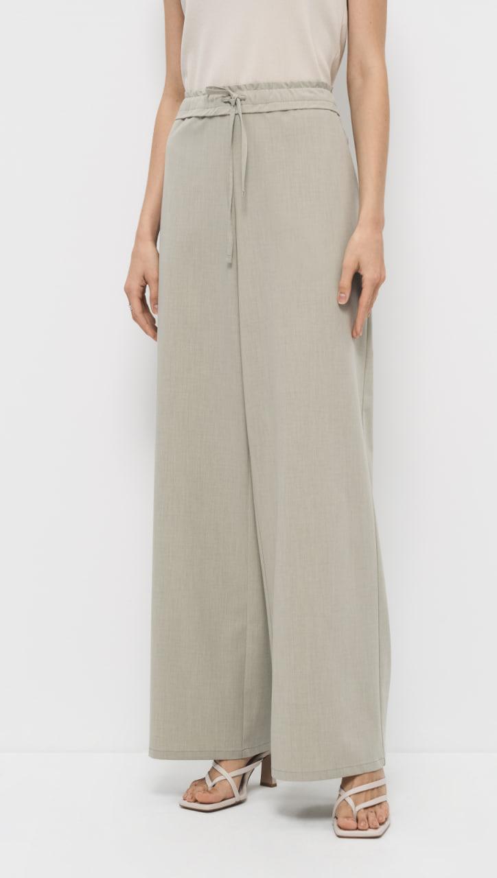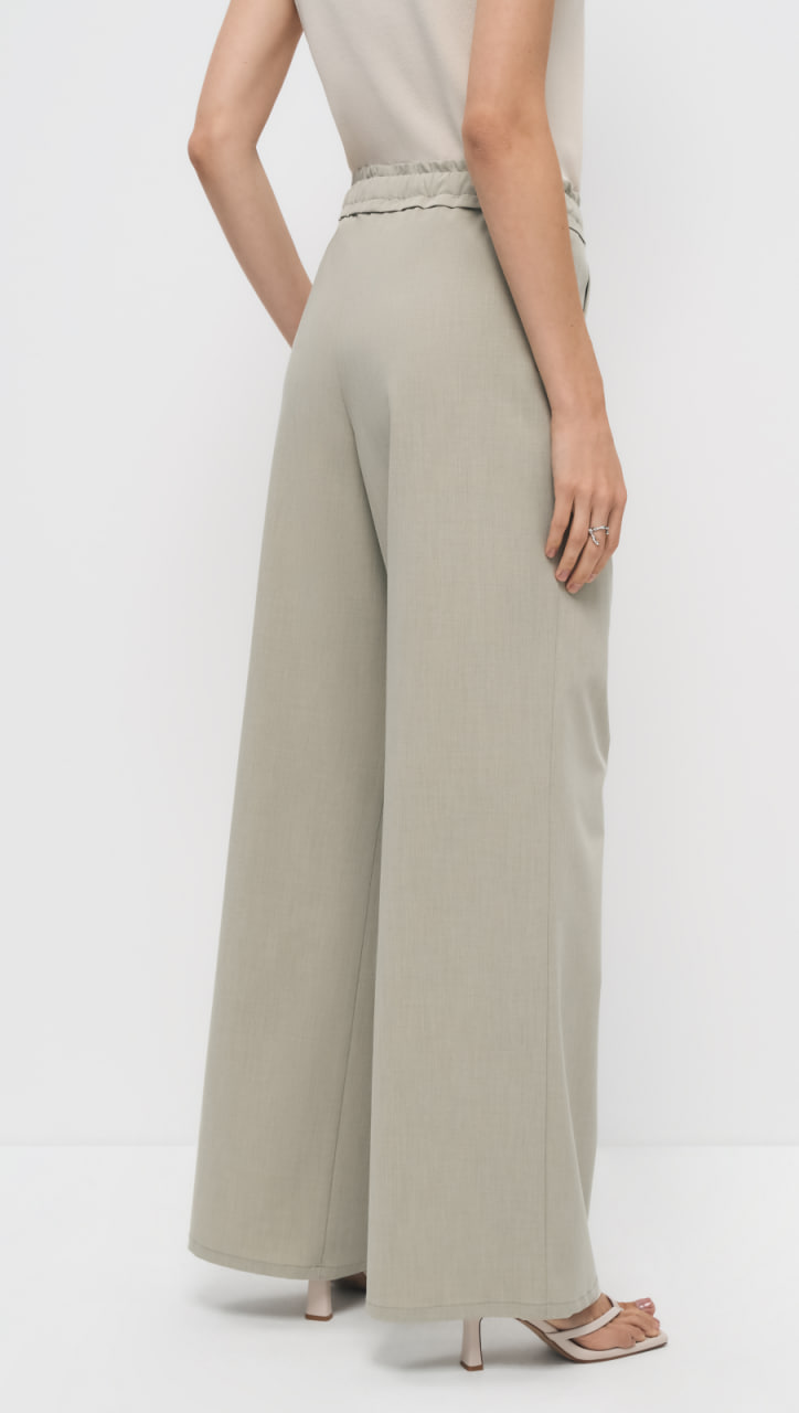 Брюки полной длины выполнены из легкой струящейся ткани в освежающем оттенке «мятный моти». Брюки характеризуются прямым свободным силуэтом, который обеспечивает комфорт и свободу движений. Главная декоративная особенность модели - интересный пояс на резинке, который обеспечивает комфортную посадку и свободу движений. На поясе расположены две отделочные строчки, придающие ему уникальную форму и акцентирующие внимание на талии.
