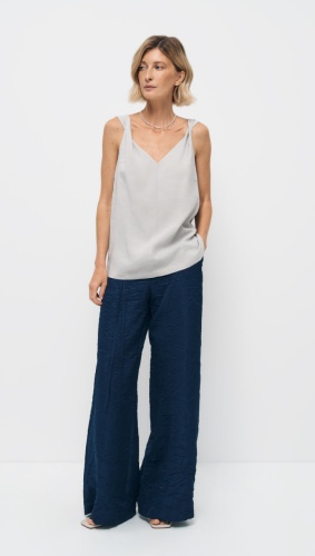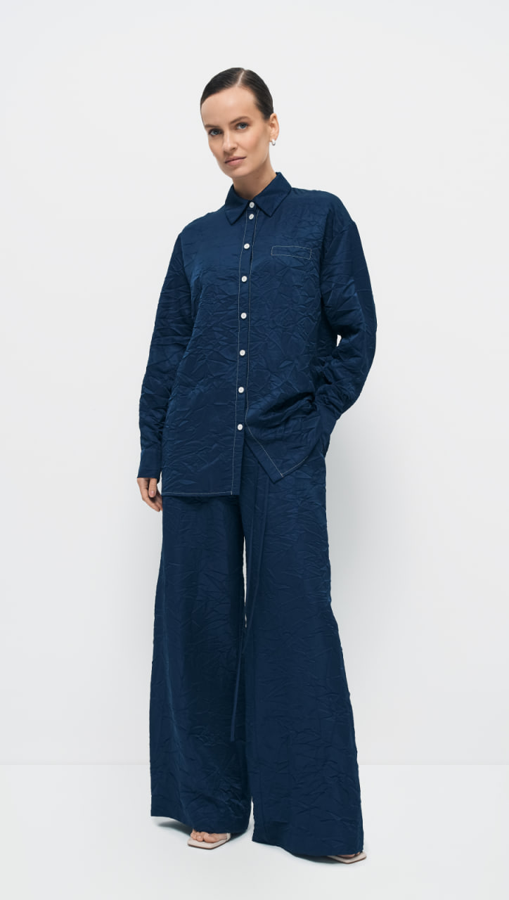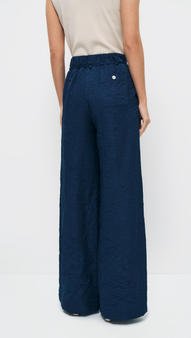 Брюки полной длины выполнены из приятной на ощупь вискозы с мятым эффектом в цвете «полночный синий». Силуэт прямой, свободный. Притачной пояс с эластичной тесьмой в задней части обеспечивает идеальную посадку, подчеркивая фигуру.