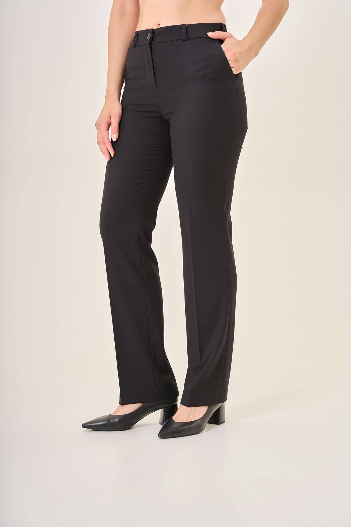 Женские классические брюки прямого кроя. Комфортная посадка на талии и элегантный крой идеально подходят для офисного и повседневного гардероба. Сзади расположены два аккуратных накладных кармана, подчёркивающие классическую стилистику изделия. Плотная ткань сохраняет форму и выглядит презентабельно на любой фигуре. Осень-Зима'25/26