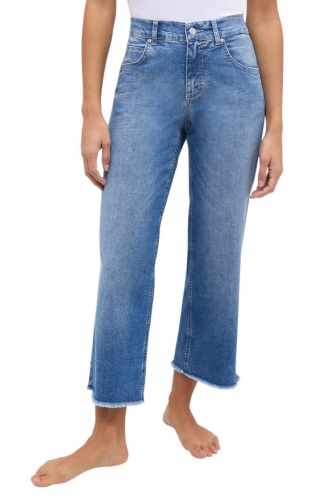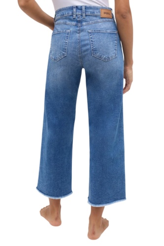 Эти укорочённые джинсы воплощают в себе сочетание комфорта и стиля. Широкие штанины и необработанный край придают модели особую небрежность и свободу. Светло-голубой оттенок позволяет легко комбинировать их с различными элементами гардероба. Петли для ремня и удобная застежка на пуговице завершают образ элегантностью и функциональностью, делая эти джинсы идеальным выбором для повседневных образов, которые всегда остаются актуальными.