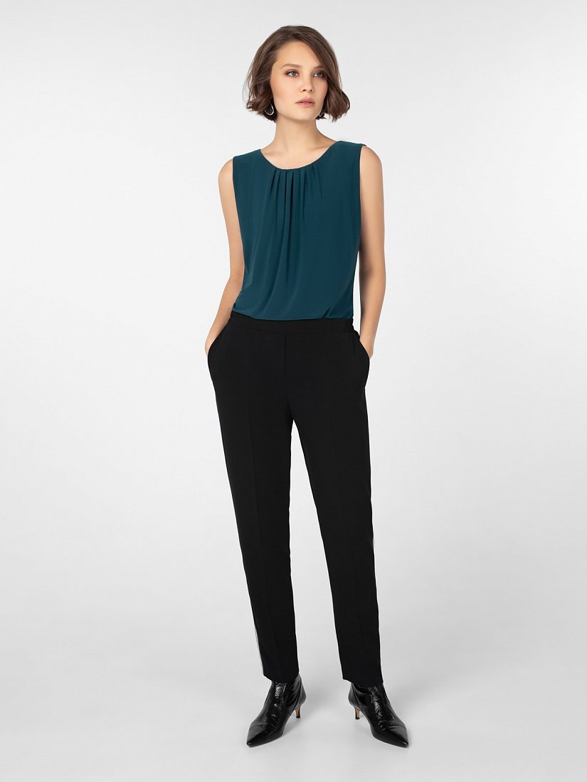 Брюки из костюмной ткани зауженного к низу силуэта на притачном поясе с резинкой и боковыми карманами. По бокам лампасы контрастного цвета.