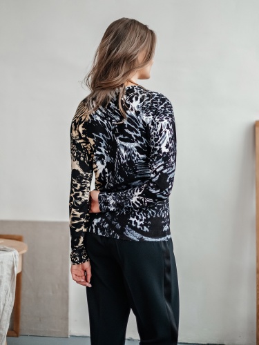 Теплый джемпер обращает на себя внимание благодаря цветочному принту в акварельном стиле. Прямой покрой, круглый вырез горловины, втачные рукава полной длины. Завершает изумительный дизайн декор из страз. Материал из вискозной смеси приятен к телу и обеспечивает комфорт.