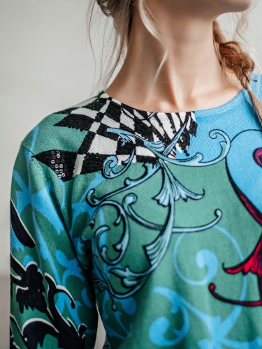 На сайте указаны Российские размеры. Теплый джемпер обращает на себя внимание благодаря контрастному принту. Прямой покрой, круглый вырез горловины, втачные рукава 3/4. Завершает яркий дизайн декор из пайеток. Приятный к телу материал из смеси вискозы и хлопка обеспечивает комфорт.