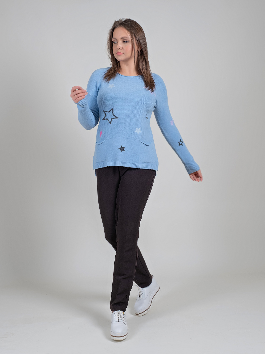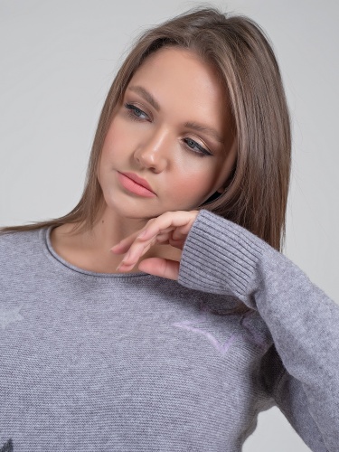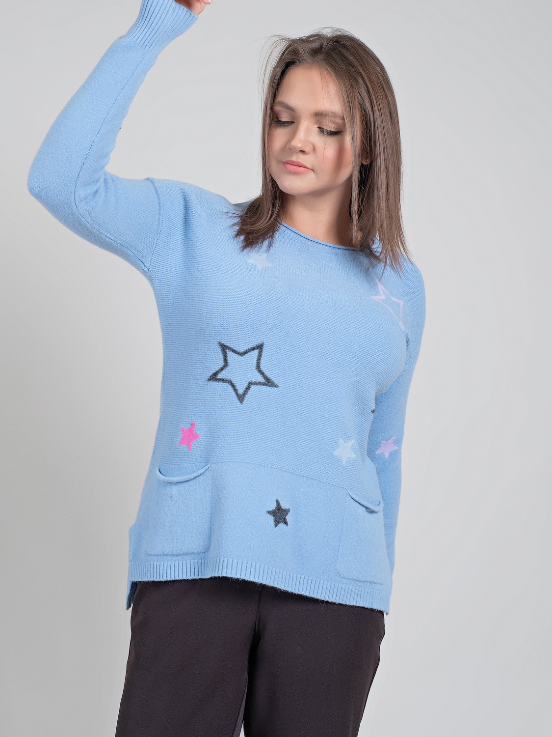 В мягком джемпер будет тепло и уютно холодной зимой. Оригинальный звездный принт придаст неформальность образу.Овальная горловина, втачной рукав полной длины со спущенным плечом, удлиненная спинка. Спереди имеется два накладных кармана.