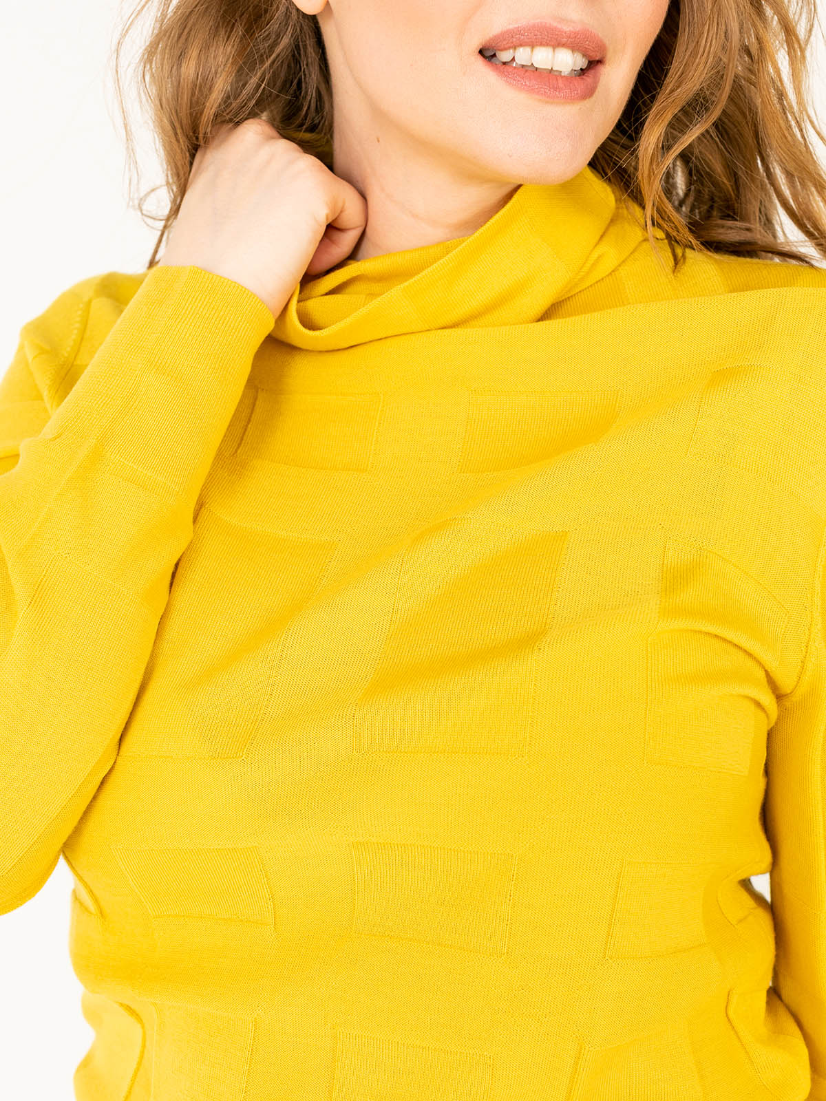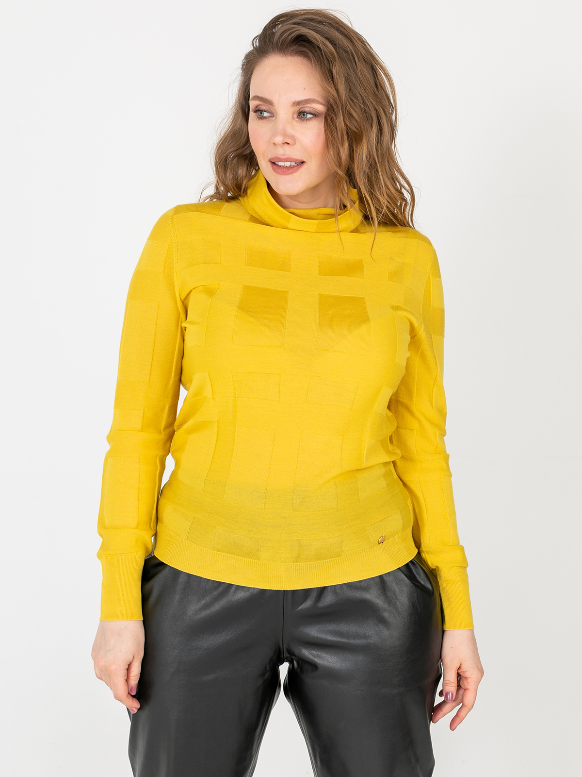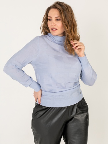Однотонная водолазка – базовый элемент гардероба любой женщины. Геометрическая фактура задает динамику образу. Материал из натуральной шерсти. Втачной рукав полной длины, ворот-хомут.