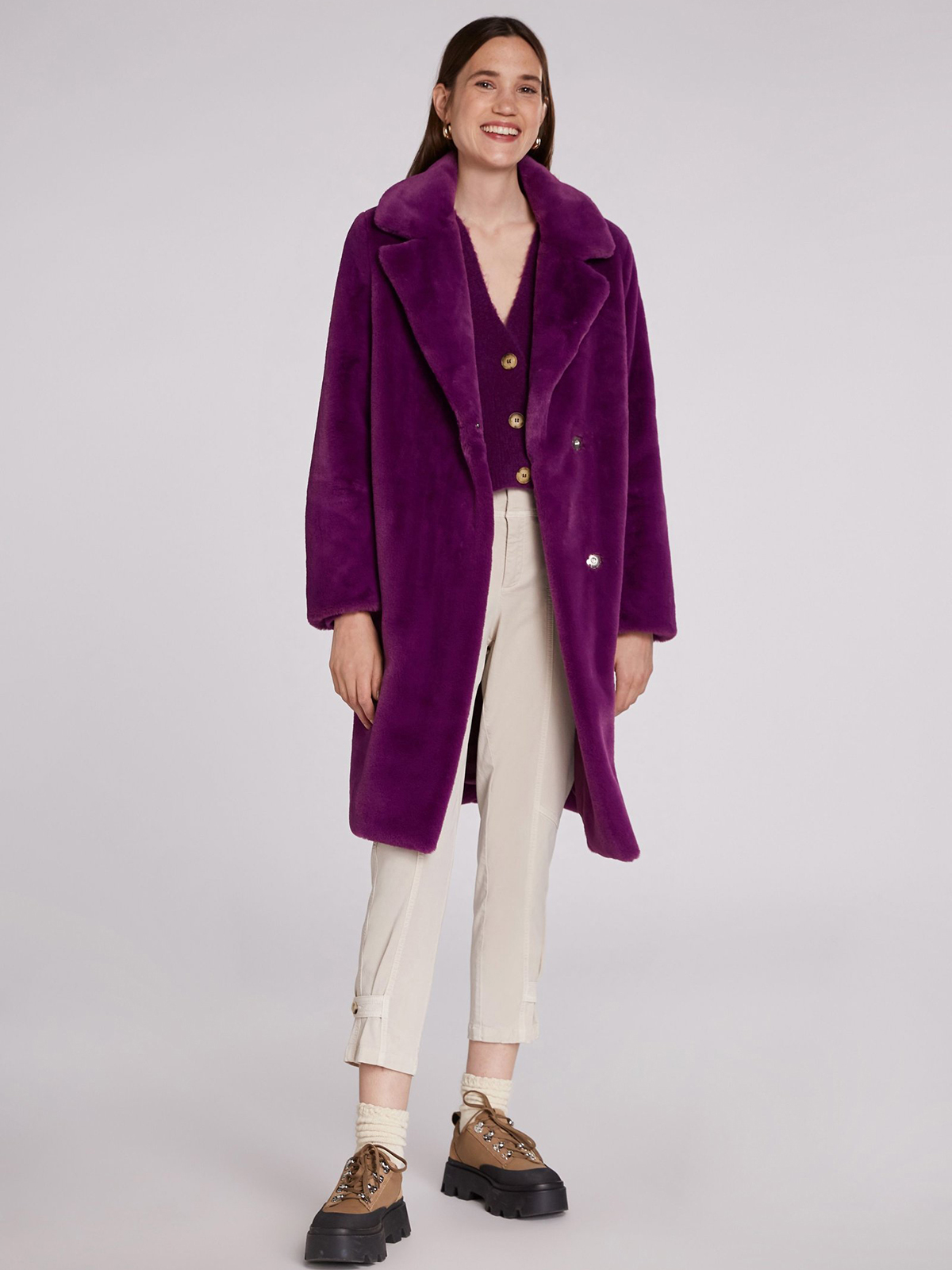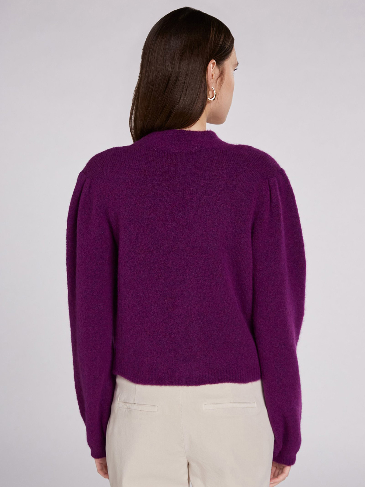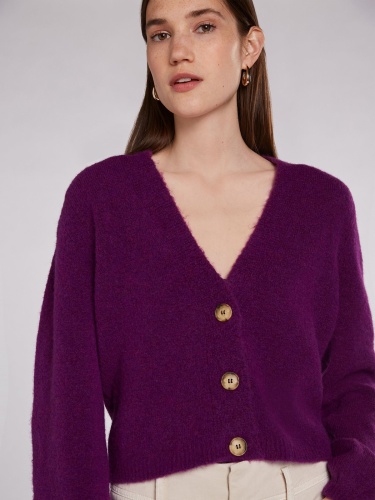 Кардиган насыщенного фиолетового оттенка с V-образным вырезом и контрастными пуговицами. Рыкава епископа – широкие рукава, стянутые у запястья – стильный атрибут данной модели. Материал из смесовой шерсти мягок и приятен к телу. Длина 50 см для размера 42. Рост модели 178 см, ее размер – 42 (российский).