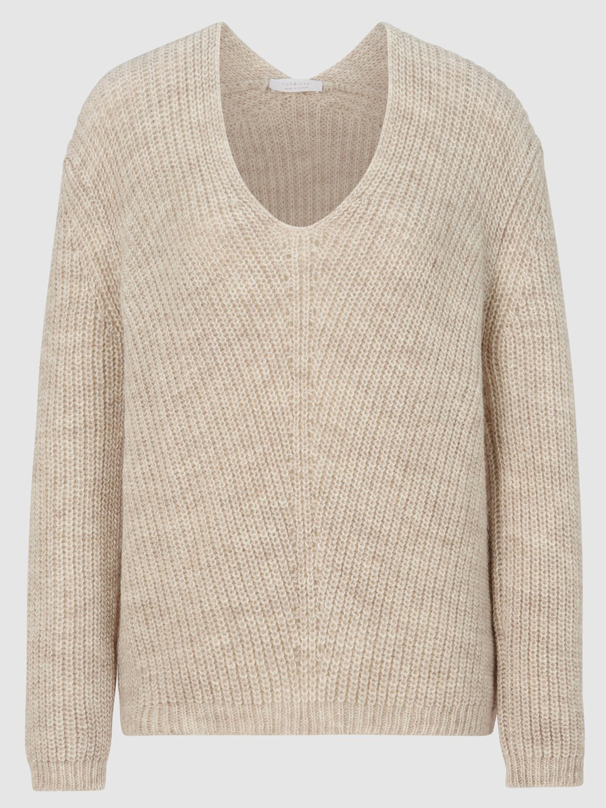 Пуловер крупной вязки с V-образный вырез горловины. Базовая модель прекрасно сочетается с различными образами. Свободный силуэт, спущенная линия плеча создают расслабленный образ. В составе материала шерсть альпаки, что делает пуловер приятным к телу.