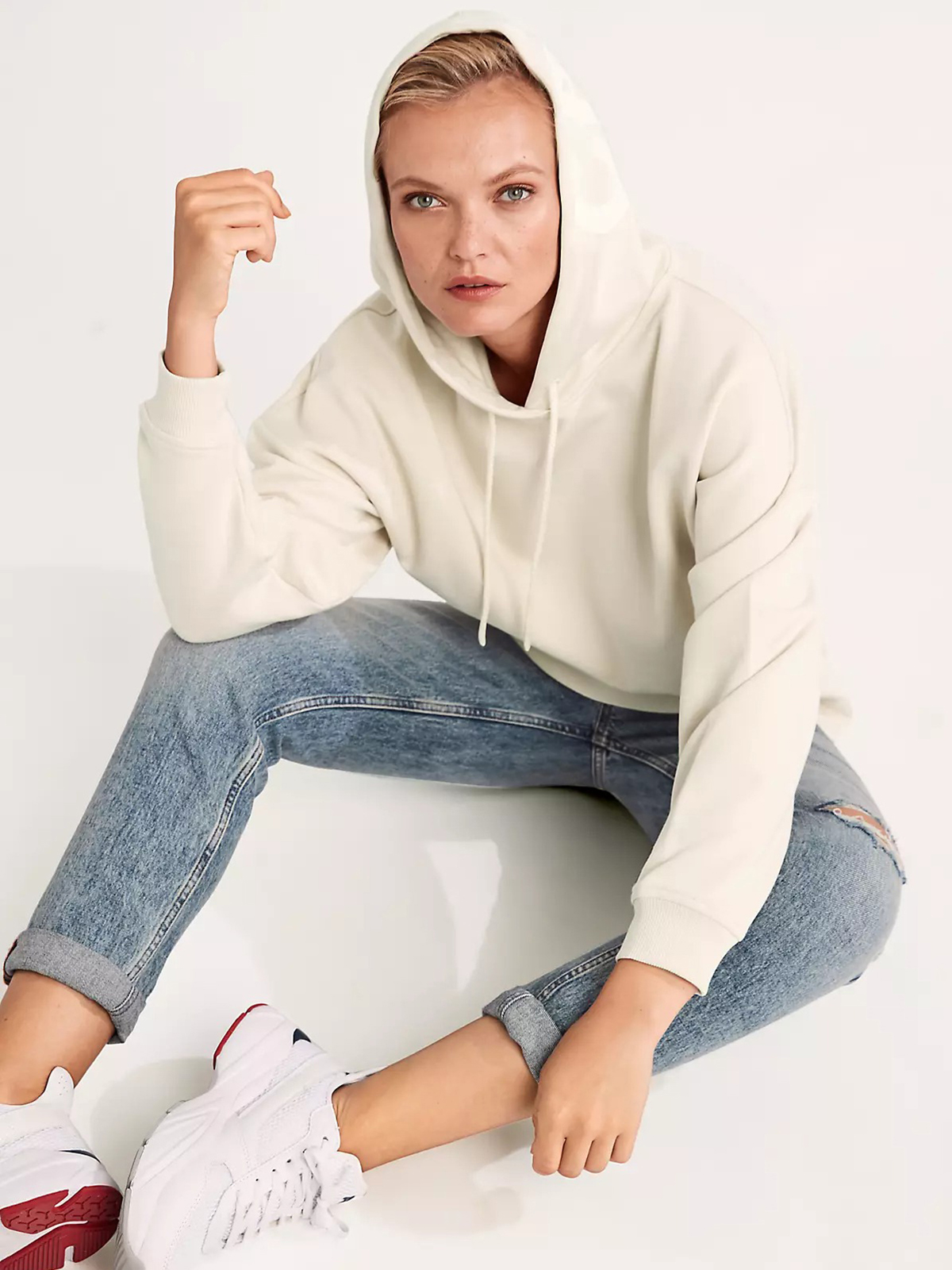 Базовая бежевая толстовка для повседневных образов в городском и спортивном стиле. Свободный силуэт и спущенная линия плеч придают расслабленную небрежность образу. Глубокий капюшон с кулиской украшен принтом –надписью в тон изделия.
