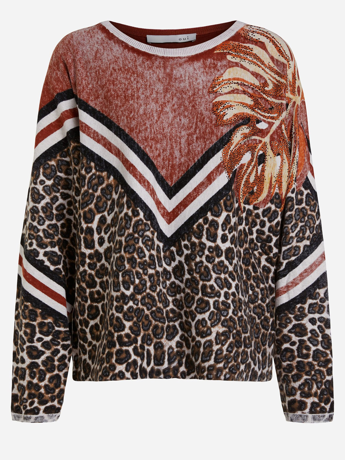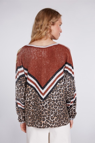 Джемпер свободного силуэта с анималистичным дизайном. Широкий овальный вырез горловины, спущенная линия плеч. Длина 62 см для 42 российского размера. Рост модели 178 см, ее размер - 42.