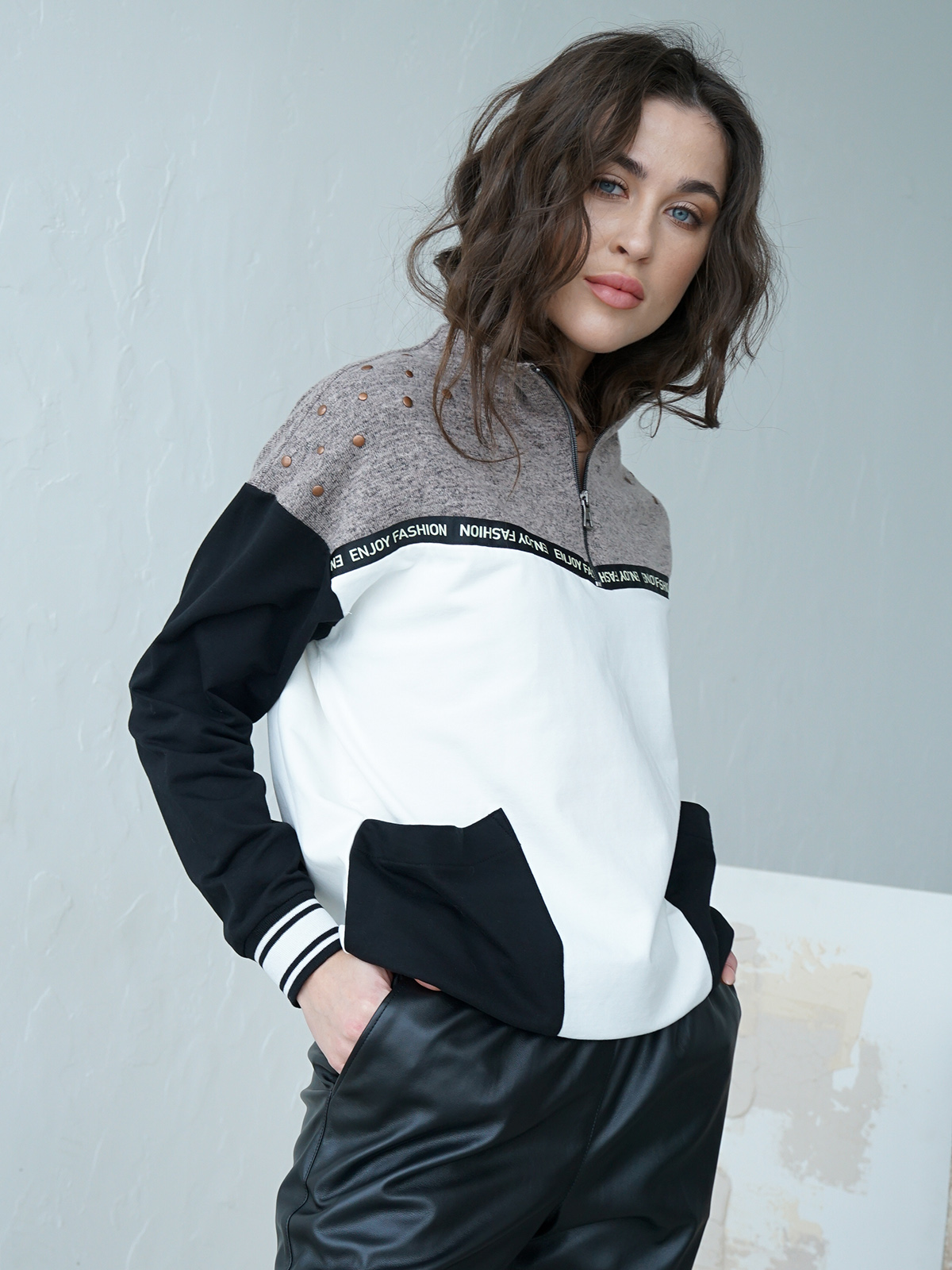 Джемпер в спортивном стиле выполнен из смесового хлопка. Высокий воротник-стойка на молнии, свободный силуэт, спущенная линия плеч. Длинные втачные рукава с эластичными манжетами. Контрастные накладные карманы.
