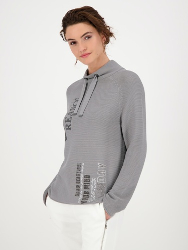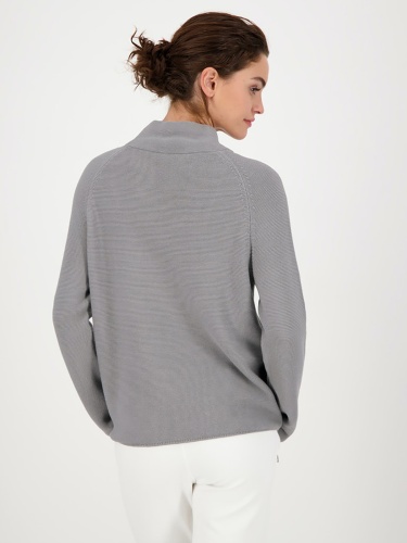 Однотонный свитшот в рубчик прямого кроя. Воротник-стойка с кулиской и широким шнурком в тон изделия. Длинные рукава-реглан