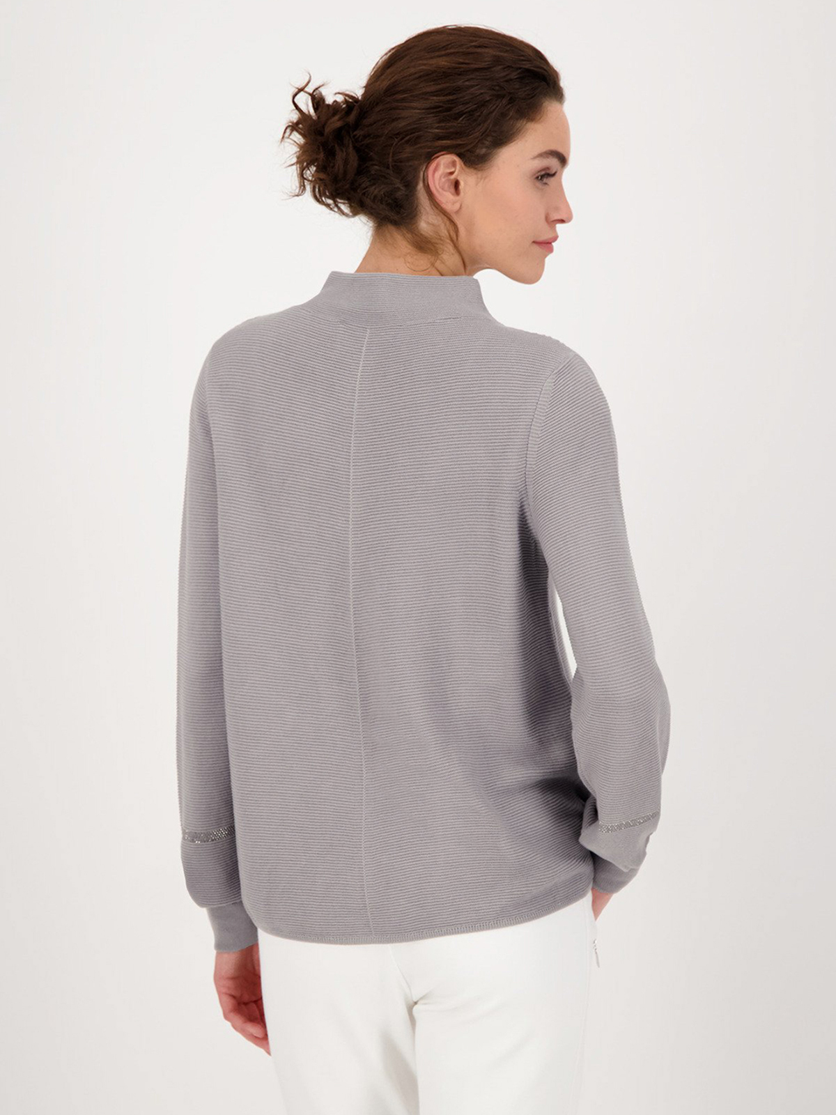 Однотонный джемпер в рубчик со швом по центру. Прямой крой, свободный силуэт, широкий воротник-стойка. Длинные втачные рукава с манжетами. В качестве декора серебристая лента на рукаве.