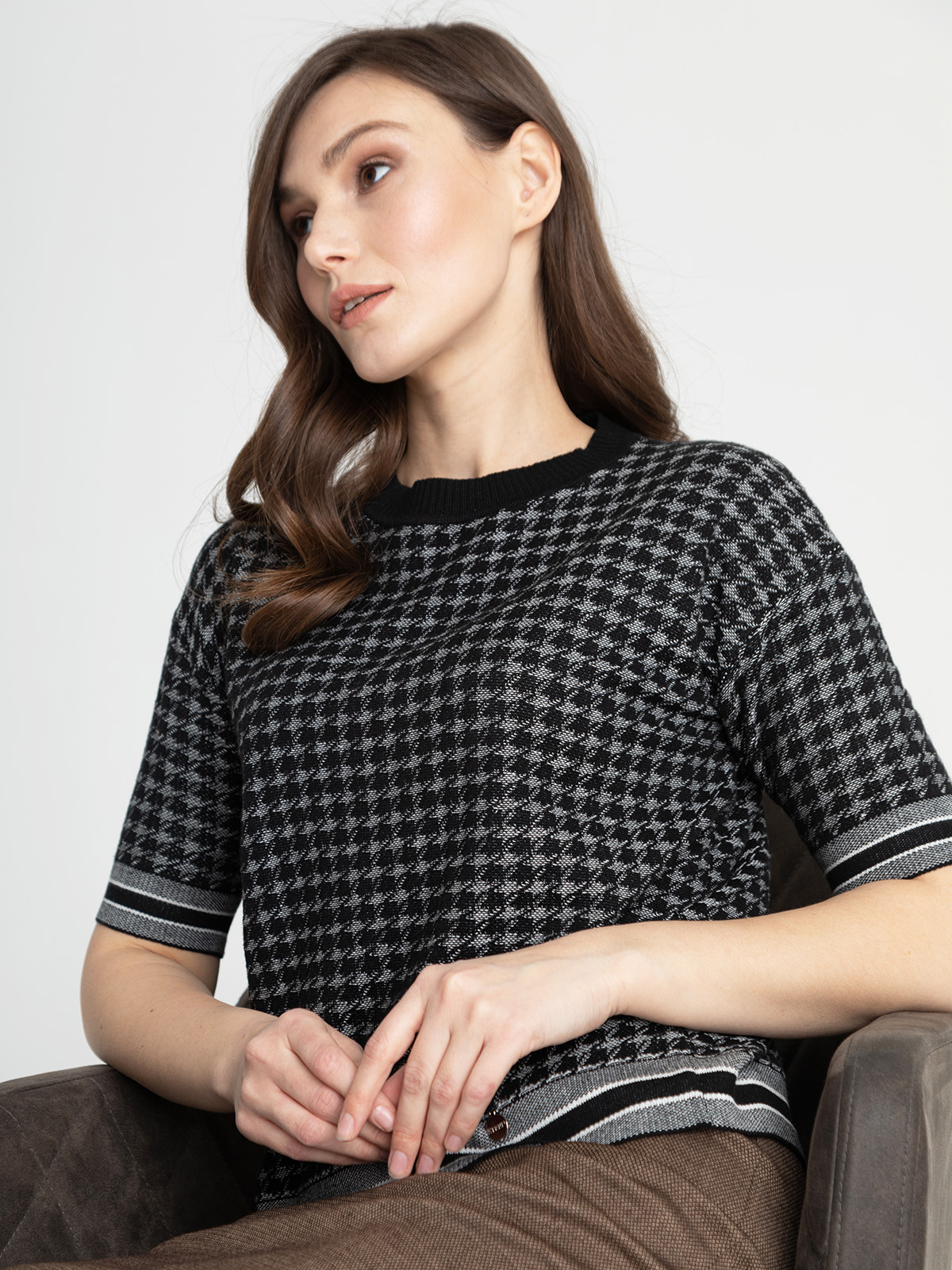 Джемпер прямого кроя с узором гусиная лапка по всей поверхности изделия. Короткий втачной рукав, спущенная линия плеч. Круглый вырез горловины, обрамлен черной бейкой в рубчик.