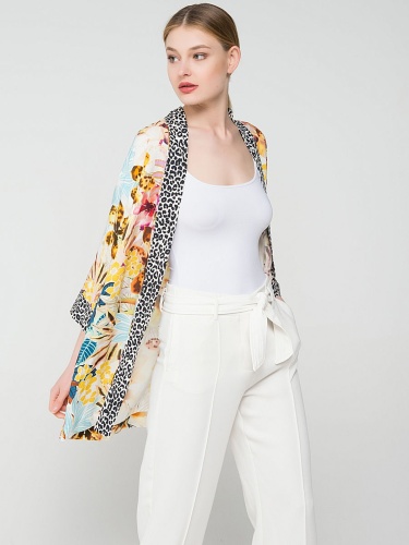 Вискозный кардиган демонстрирует удачное сочетание трендовых принтов - цветочного и звериного. Рукав 3/4, свободный покрой. То, что нужно, чтобы лето заиграло всеми красками!