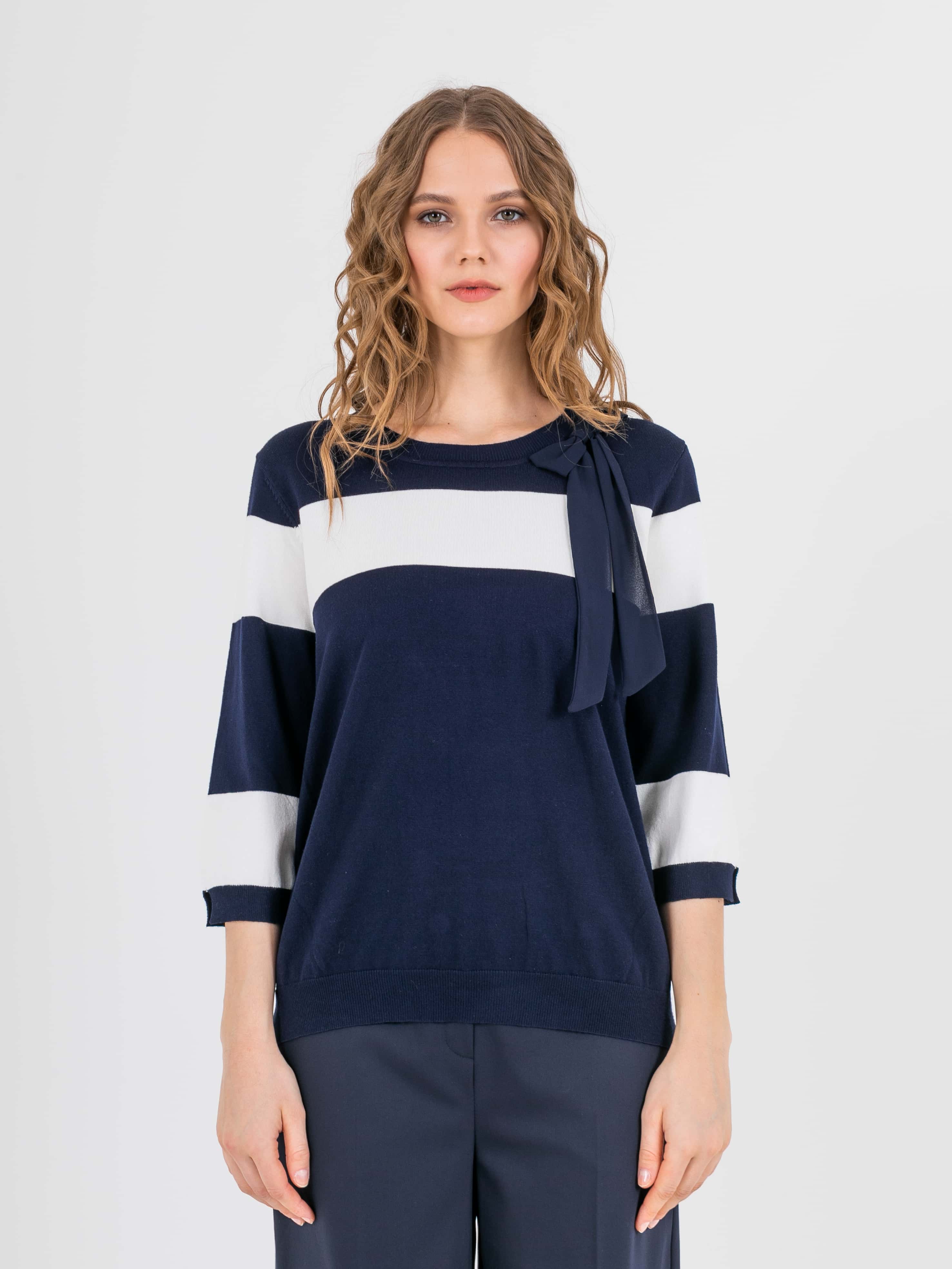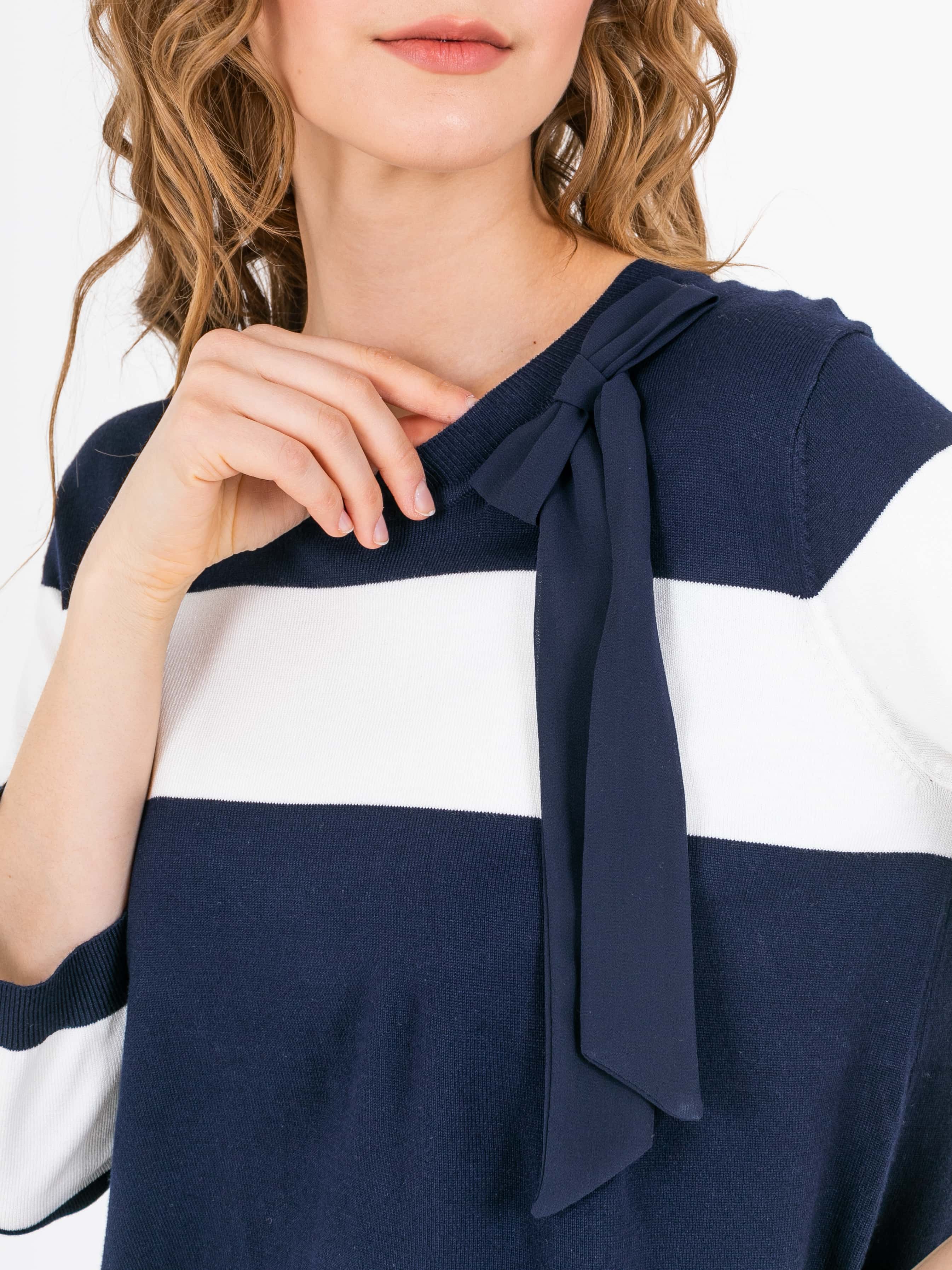 На сайте указаны российские размеры. Ткань: 60% вискоза, 35% нейлон. Крой: слегка приталенный джемпер из мягкой вискозы. Благодаря нейлону в составе изделие хорошо держит форму, не деформируется в процессе носки и стирки. Имеет достаточную длину, которая хорошо прикрывает область живота и часть бедер, что позволяет деликатно скрыть возможные недостатки фигуры. Отделка: в верхней части джемпера располагаются завязки, которые можно оформить в узел или в бант. Короткий рукав украшает изысканный круглый вырез, добавляющий романтичности всему образу. Найдите идеальную пару в разделах юбок, брюк и джинсов на нашем сайте.