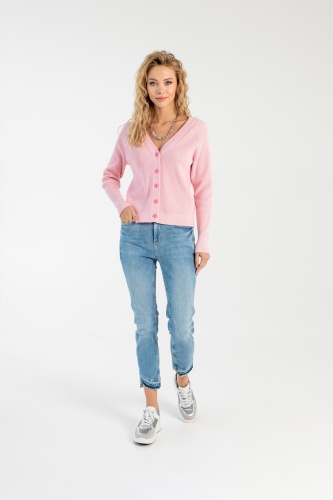 На сайте указаны российские размеры. Ткань: кардиган выполнен из трикотажного материала – смеси хлопка и акрила. Крой: прямой силуэт универсален для любого типа фигуры. Кардиган из трикотажа средней плотности с V-образным вырезом можно носить самостоятельно, либо дополнять футболками, водолазками и блузками. Длину рукава с широким манжетом-резинкой можно регулировать до нужного уровня. Отделка: фактура «лапша» приятна на ощупь и визуально удлиняет силуэт благодаря вертикальным полосам. Стильные круглые пуговицы делают образ ярче и интереснее, а скромный фирменный подвес в нижней части кардигана приковывает взгляды. Кардиган отлично впишется как в повседневные и деловые образы с брюками, джинсами и юбками из коллекции Stern. Рост модели 177 см.