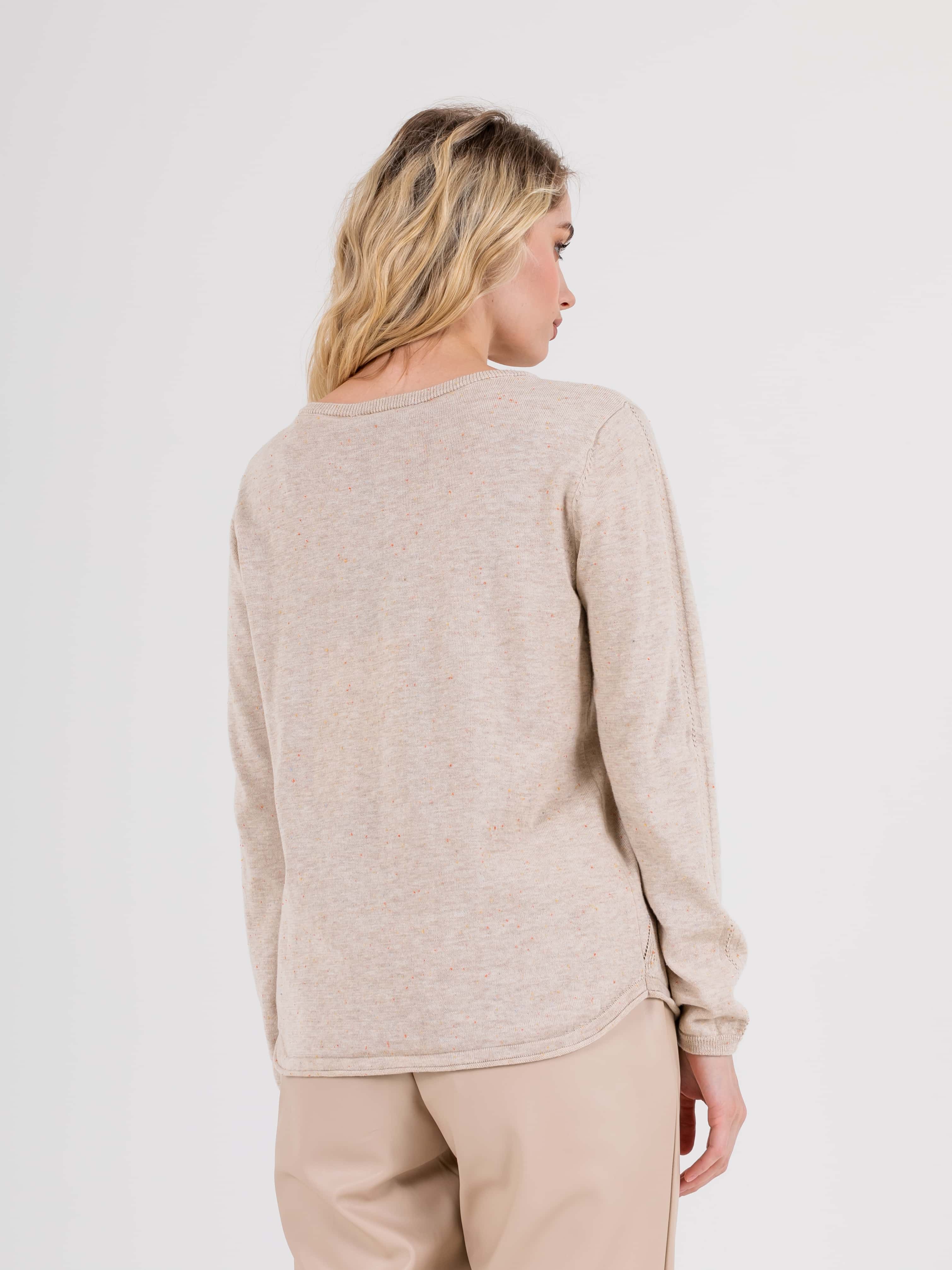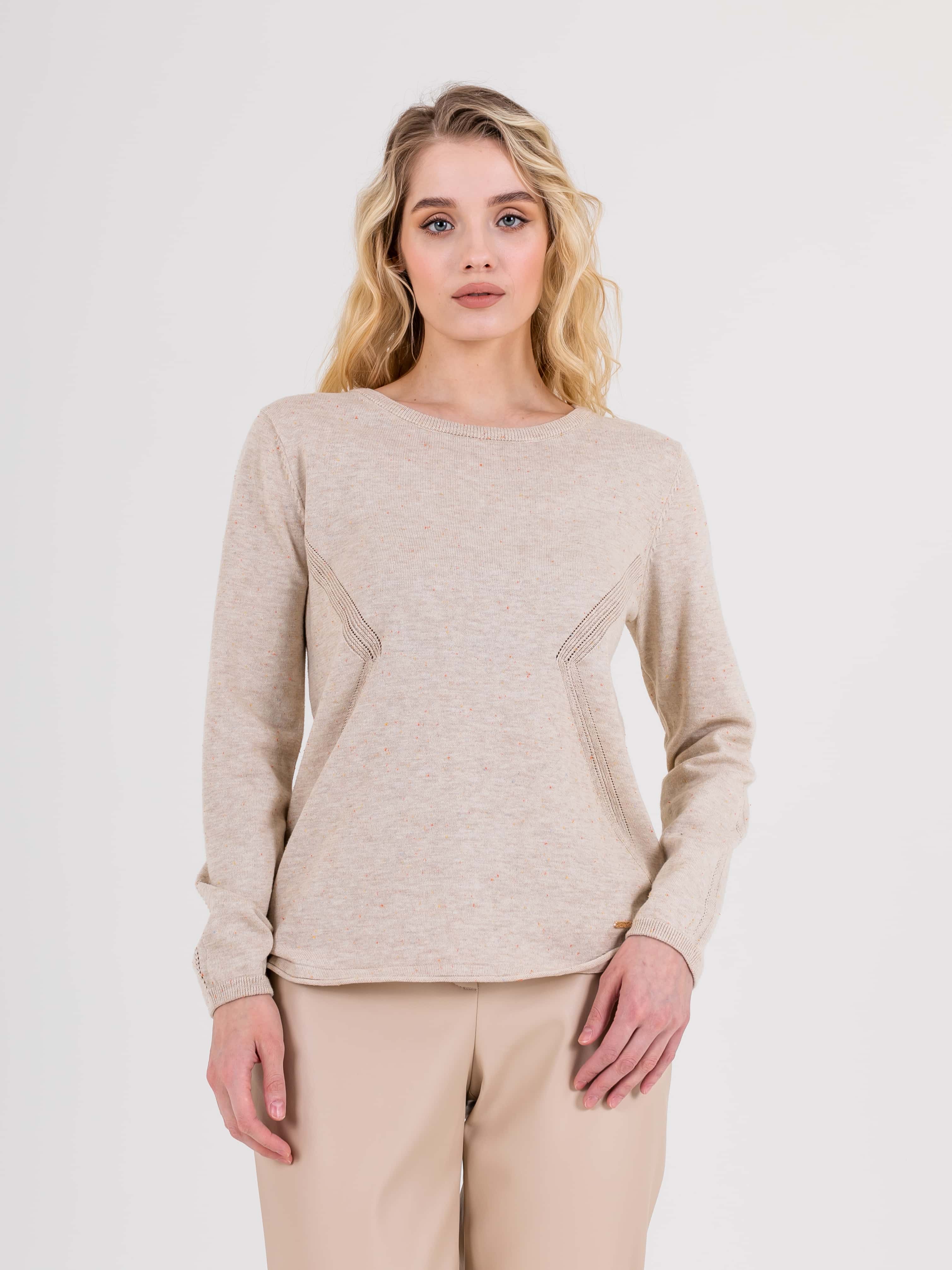 На сайте указаны российские размеры. Ткань: 65% хлопок, 35% полиэстер. Крой: джемпер свободного силуэта с круглым вырезом. Универсальная модель отличается простым, но удобным кроем и идеальной посадкой на женщин разного роста и комплекций. Выполнен из приятного трикотажа с хлопком. Отделка: передняя часть джемпера и рукава украшены выбитыми узорами, которые придают особое очарование всему образу. В структуре ткани присутствуют цветные вкрапления, которые добавляют свежести образу. Сочетайте с кожаными или трикотажными брюками, а также юбками из ассортимента Stern. Рост модели - 177 см