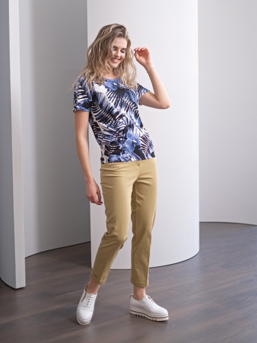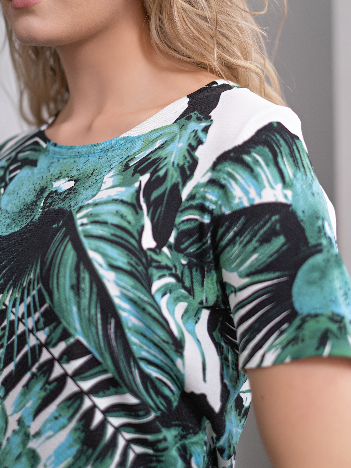 Прямой покрой джемпера скроет недостатки фигуры. Круглый вырез горловины создаст женственный образ. Модный в новом сезоне принт с тропическим мотивом подчеркнет чувство вкуса обладательницы джемпера. Данная модель будет удачно сочетаться как с брюками, так и с юбкой.