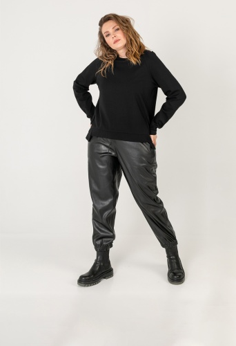 На сайте указаны российские размеры. Состав: смесовая ткань средней плотности. В составе: 30% хлопок, 65% вискоза, 5% эластан. Отделка: 96% полиэстер, 4% эластан. Крой: лаконичный джемпер прямого силуэта с длинным рукавом и круглым вырезом. Идеально садится по фигуре, скрывая недостатки, а насыщенный черный цвет визуально делает образ еще стройнее. Отделка: спинка джемпера украшена декоративной вставкой из гладкой ткани, детали основного материалы соединяются перемычкой в цвет. Обратите внимание на коллекцию кожаных брюк в соответствующем разделе нашего сайта. Они идеально подходят к этому джемперу.