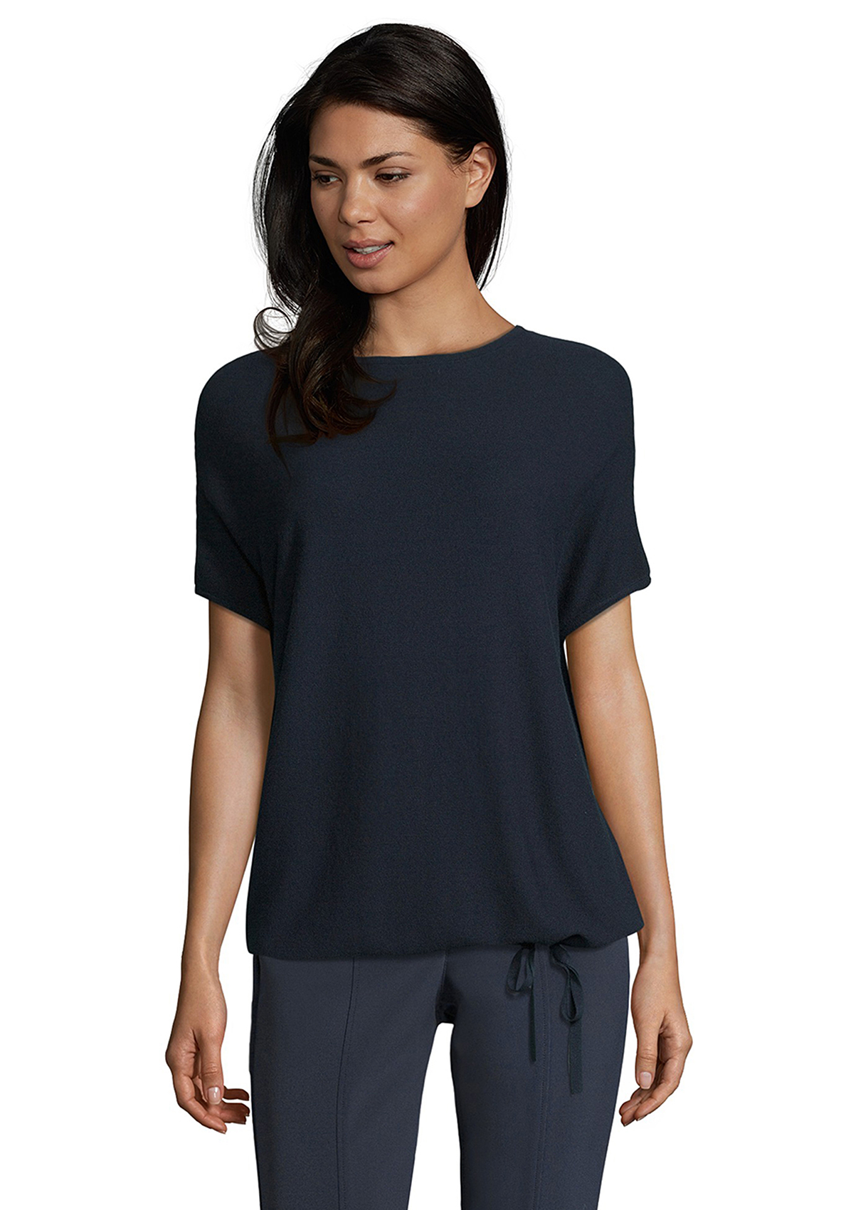 Лаконичный дизайн джемпера позволяет создавать множество стильных комплектов. Джемпер прямого покроя, вырез горловины "лодочка", короткие цельнокроеные рукава, кулиска по ниу изделия. Приятный к телу материал из вискозной смеси обеспечивает комфорт.
