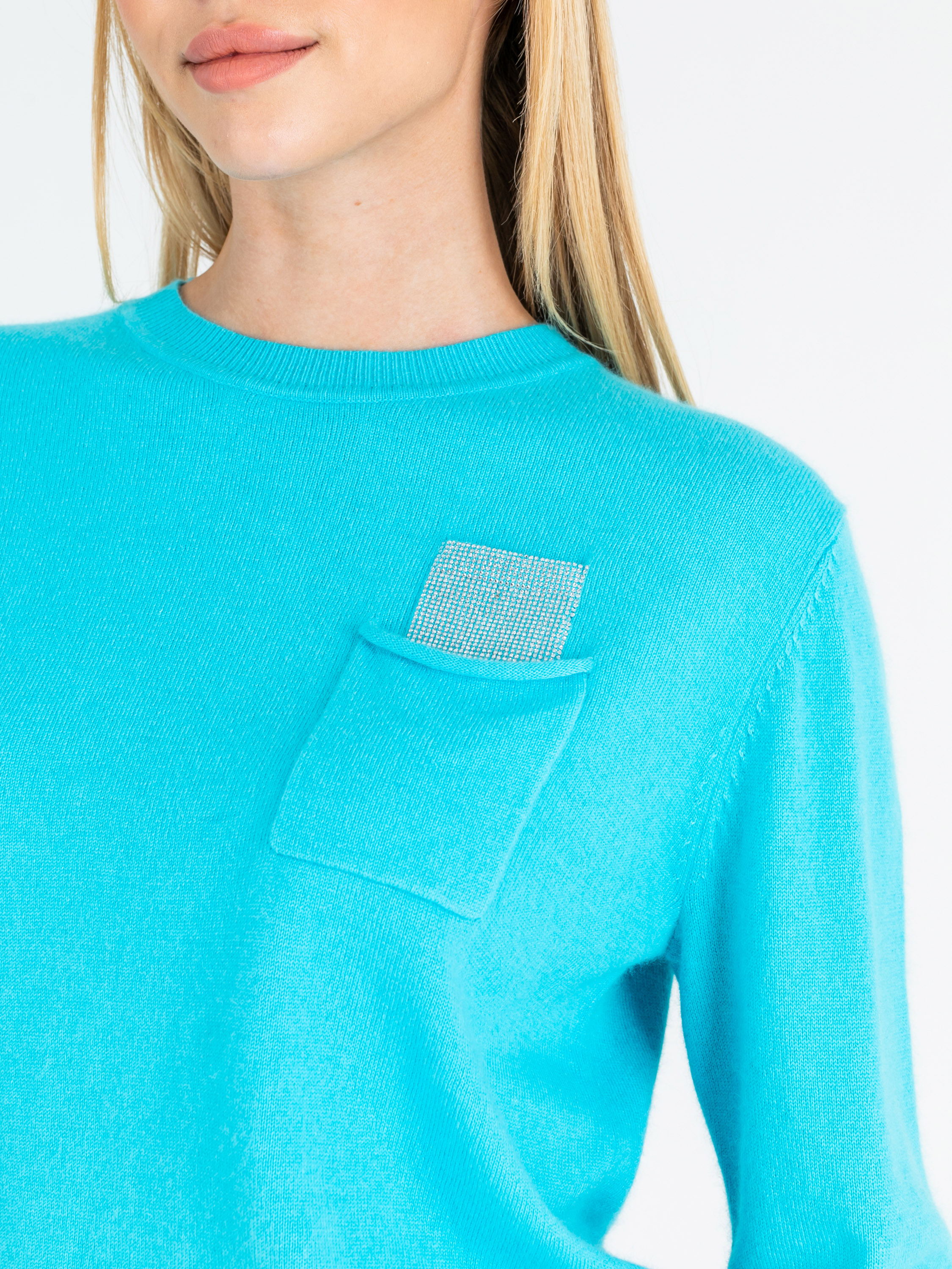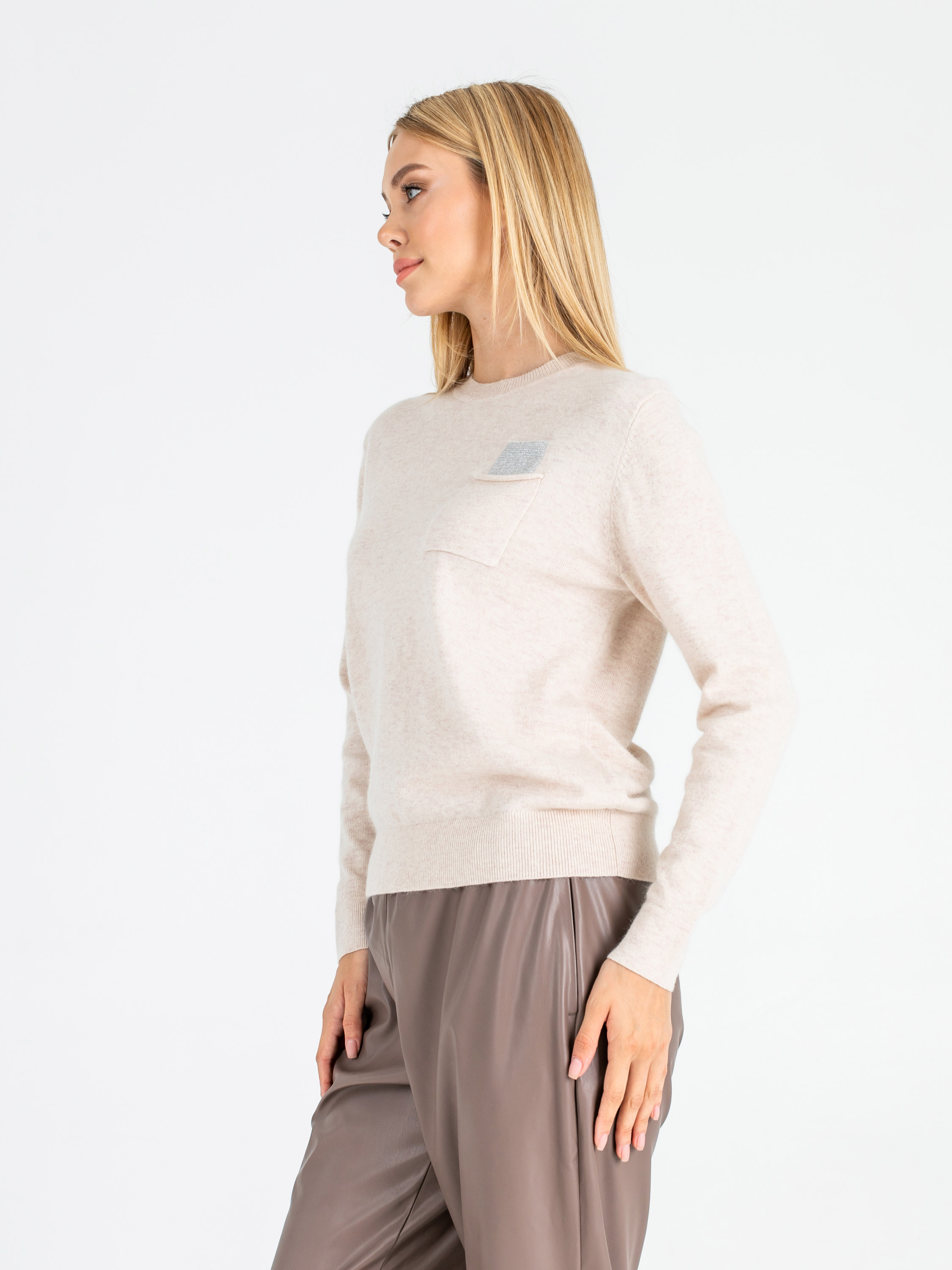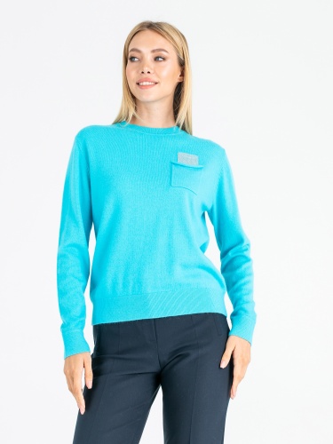 На сайте указаны Российские размеры. Ткань: смесовая ткань средней плотности. В составе: 27% вискоза, 27% нейлон, 23% ангора, 23% шерсть. Крой: джемпер слегка приталенного силуэта с круглым вырезом и длинным рукавом. Комфортный материал, где за мягкость отвечает вискоза, а за тепло – ангора и шерсть. Резинки на манжетах и конце изделия обеспечивают надежное прилегание, не открывают зону живота, что особенно актуально в холодное время года. Представлен в двух стильных оттенках – кремовом и нежно-голубом. Отделка: функциональный карман на груди украшен переливающимися стразами, которые выглядит уместно и добавляют образу праздничности. С коллекцией брюк и юбок для создания образа с джемпером можно познакомиться в соответствующих разделах нашего сайта. Рост модели - 177 см