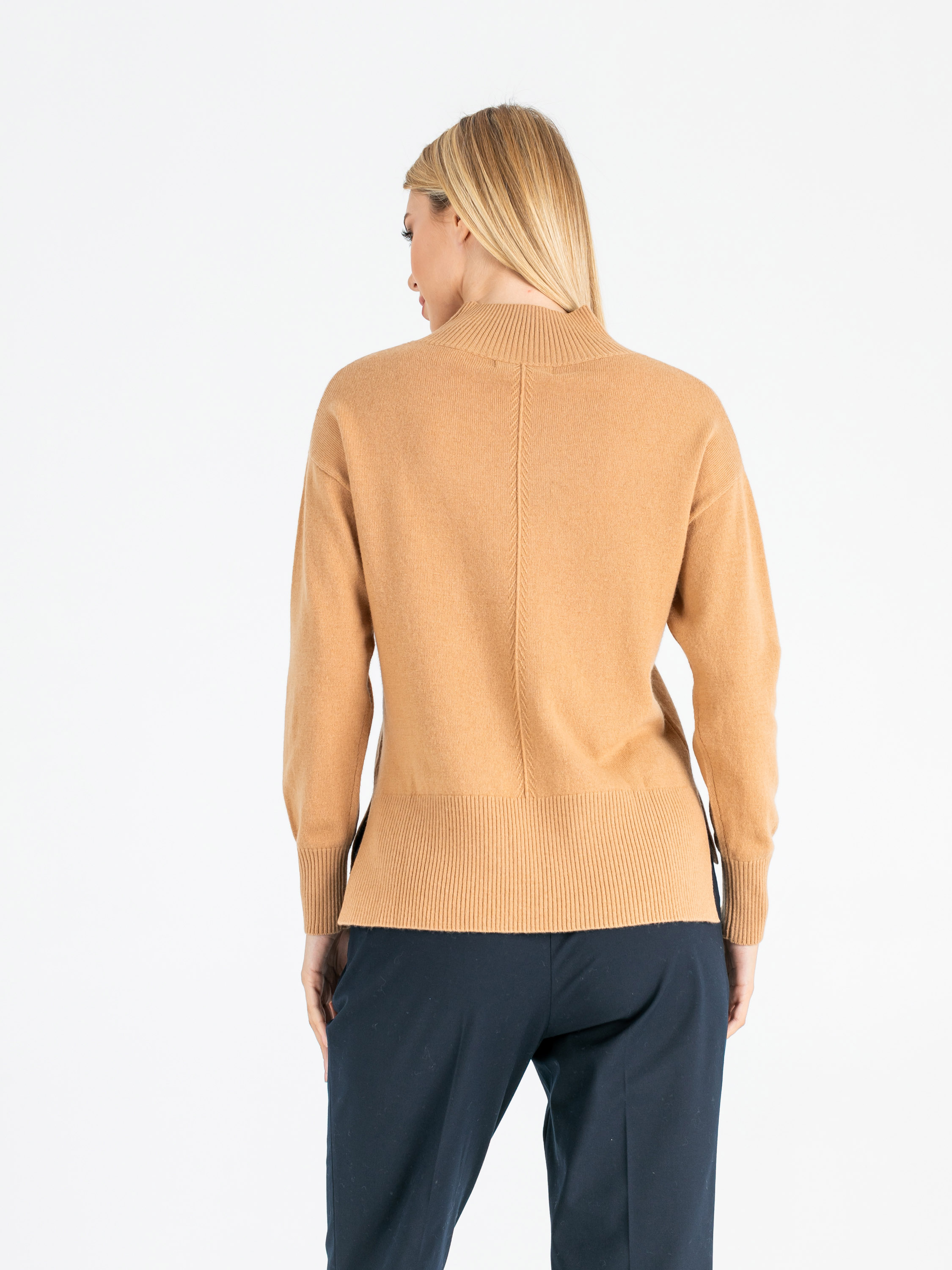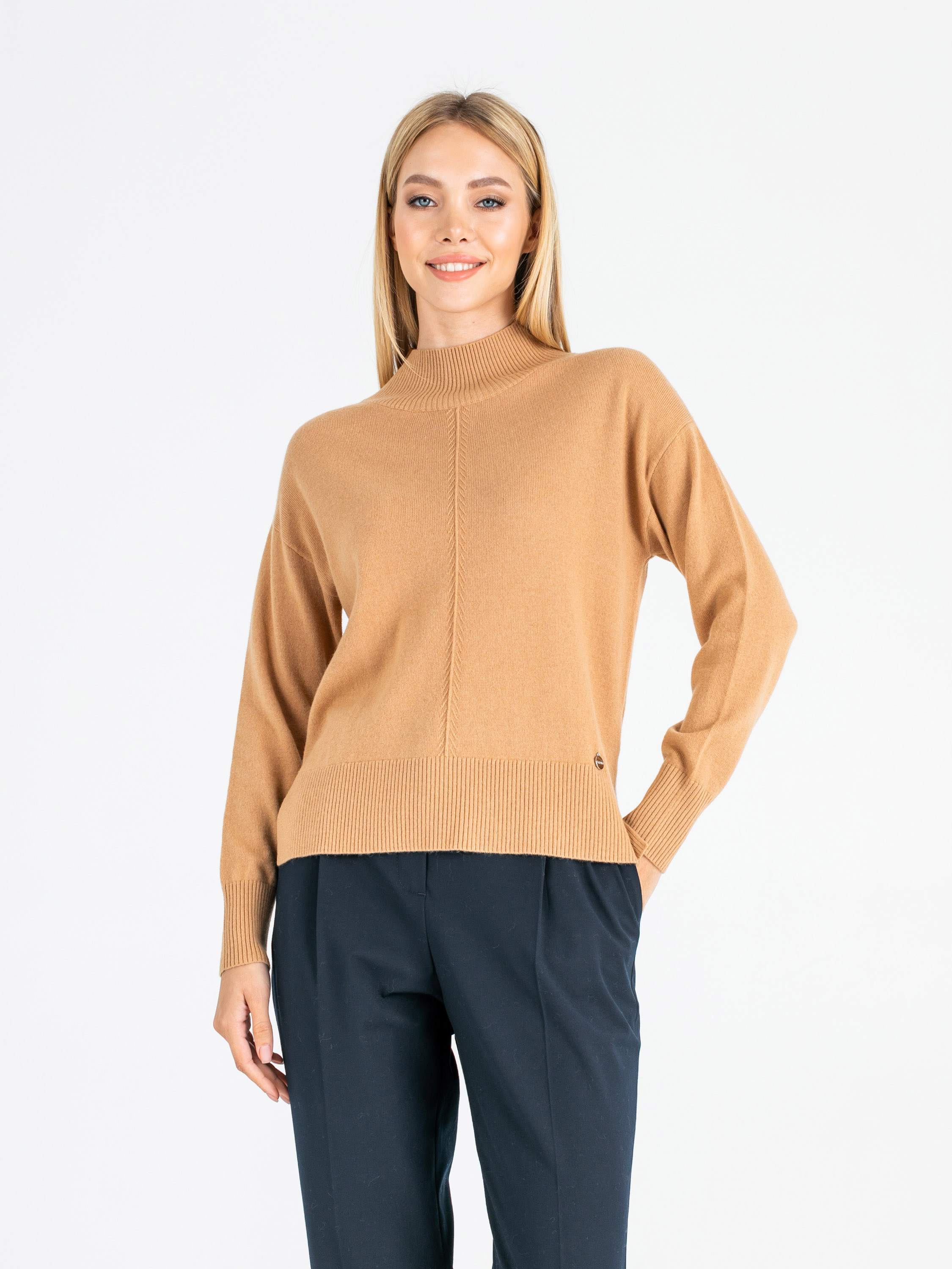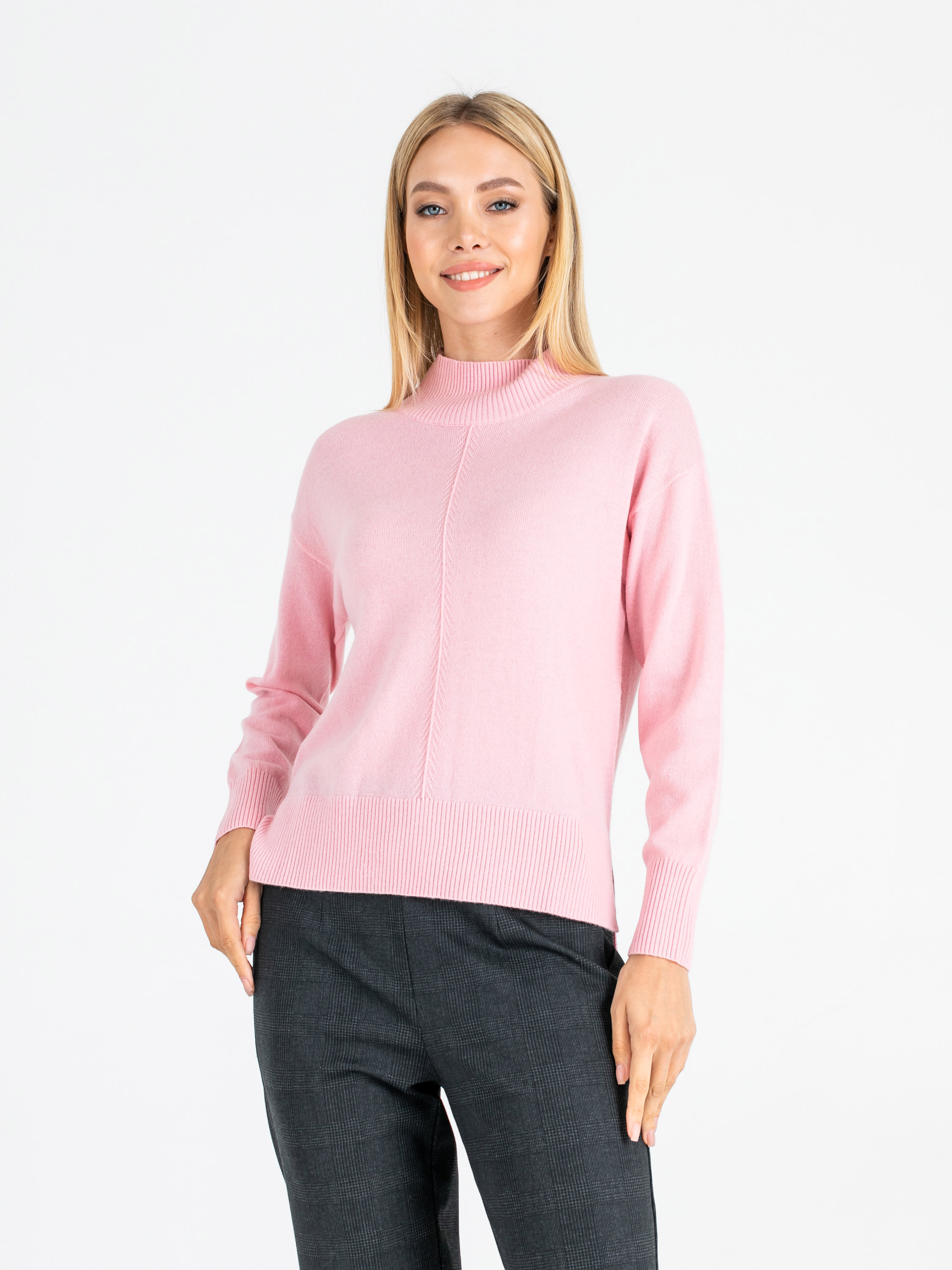 На сайте указаны российские размеры. Ткань: 90% шерсть мериноса, 10% кашемир. Крой: джемпер прямого силуэта средней длины. Имеет слегка приподнятый ворот-резинку, который подчеркивает красоту шеи, но главное – защищает горло от ветра и холода. Прикрывает зону живота, не поднимается при движении. Разрезы по бокам добавляют комфорта при движении. Представлен в двух цветах – коричневом и розовом. Отделка: увеличенная по сравнению с передней частью задняя половина джемпера прикрывает часть бедер и скрывает возможные несовершенства фигуры. Передняя и задние части украшены рельефным узором «елочкой». Подберите идеальный низ в разделах юбок и брюк на сайте Stern. Рост модели - 177 см