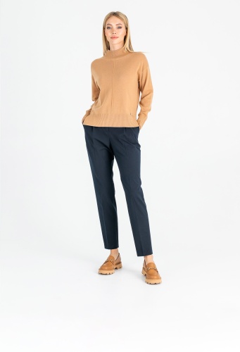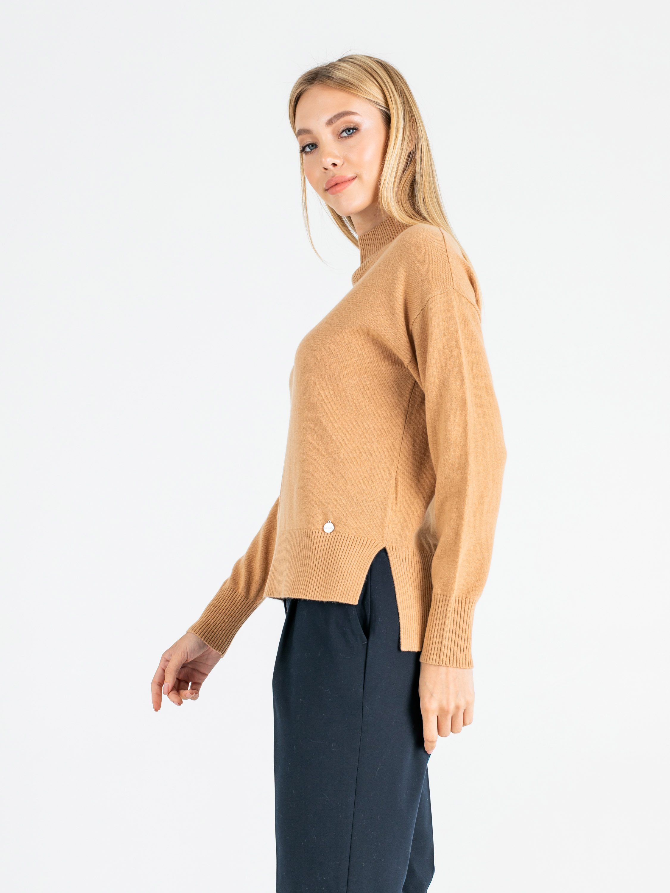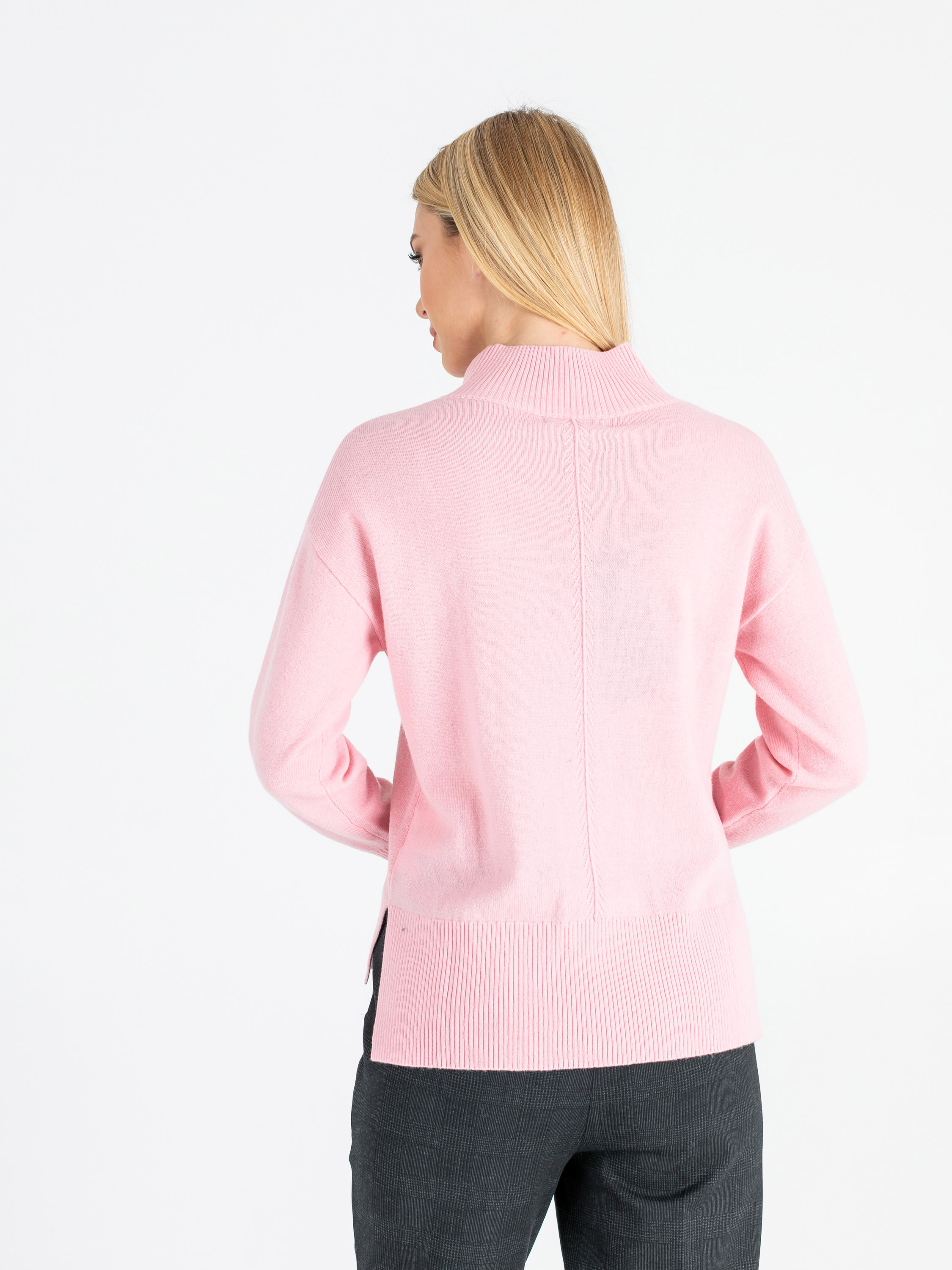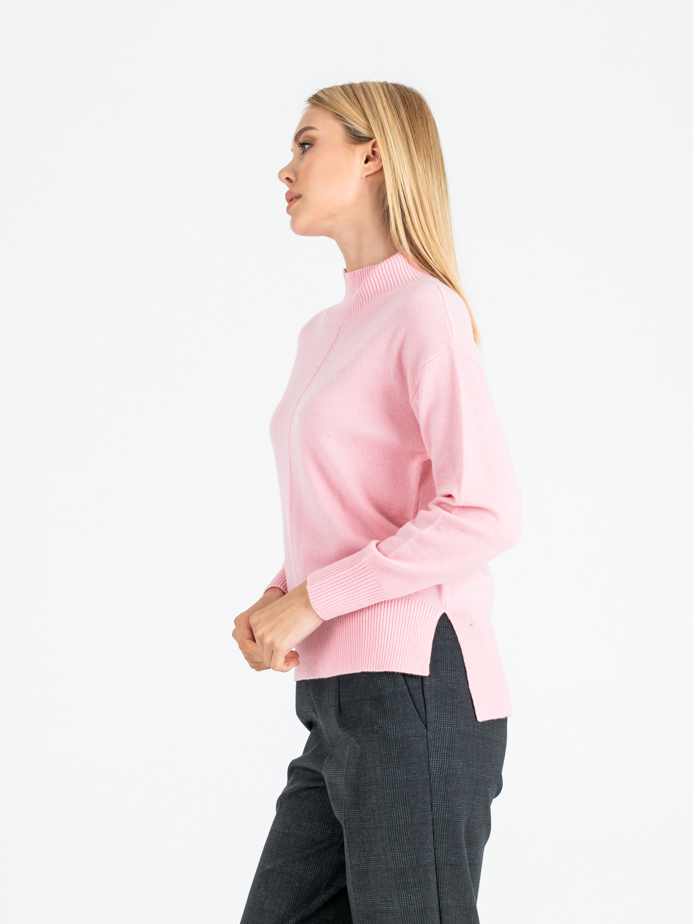 На сайте указаны российские размеры. Ткань: 90% шерсть мериноса, 10% кашемир. Крой: джемпер прямого силуэта средней длины. Имеет слегка приподнятый ворот-резинку, который подчеркивает красоту шеи, но главное – защищает горло от ветра и холода. Прикрывает зону живота, не поднимается при движении. Разрезы по бокам добавляют комфорта при движении. Представлен в двух цветах – коричневом и розовом. Отделка: увеличенная по сравнению с передней частью задняя половина джемпера прикрывает часть бедер и скрывает возможные несовершенства фигуры. Передняя и задние части украшены рельефным узором «елочкой». Подберите идеальный низ в разделах юбок и брюк на сайте Stern. Рост модели - 177 см