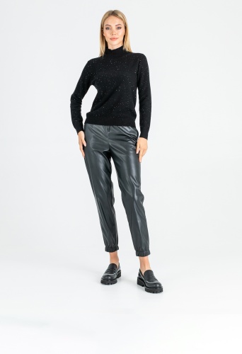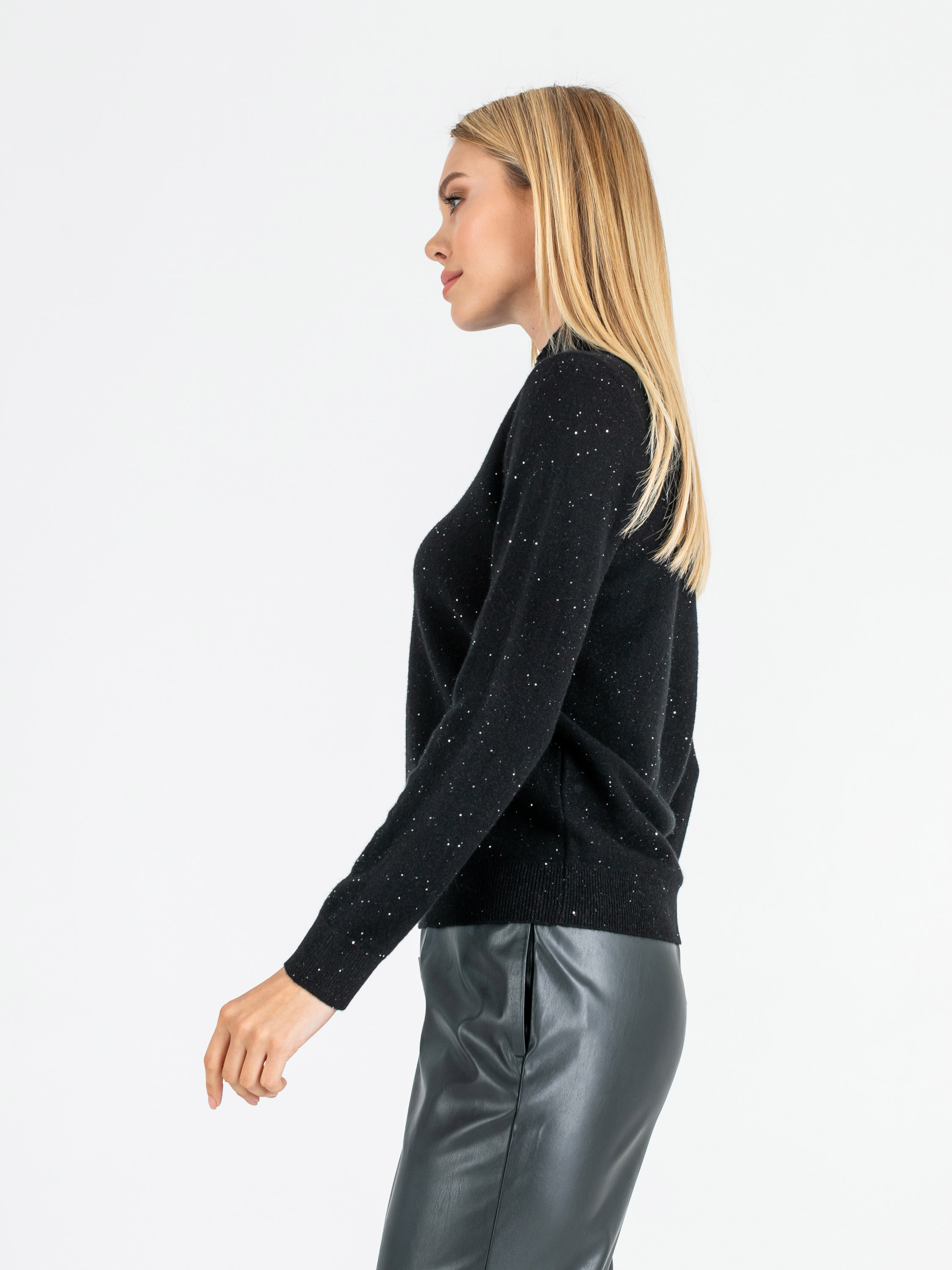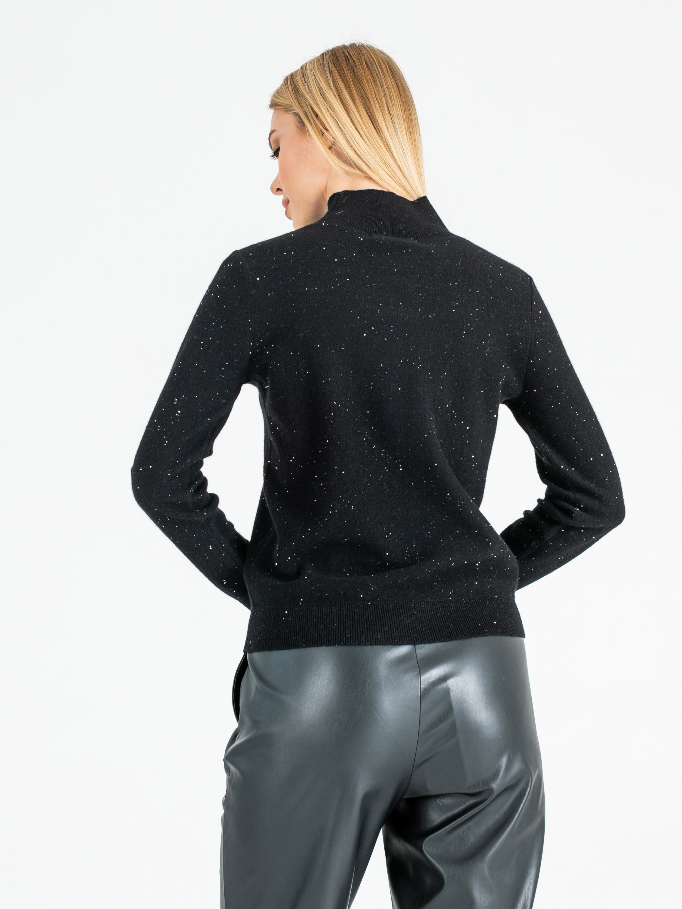 На сайте указаны Российские размеры. Ткань: 98% шерсть мериноса, 2% полиакрил. Крой: базовый однотонный джемпер приталенного силуэта. Модель, напоминающая привычную водолазку, выделяется длинным воротом-резинкой, который защищает от холода и ветра. Универсальная модель из шерсти мериноса – идеальный вариант для зимы и межсезонья. Джемпер представлен в двух стильных цветах – черном и коричневом. Отделка: легкое благородное сияние ткани придают прозрачные пайетки. Базовый компаньон для джинсов, брюк, джемперов, сарафанов, юбок и рубашек. Рост модели - 177 см