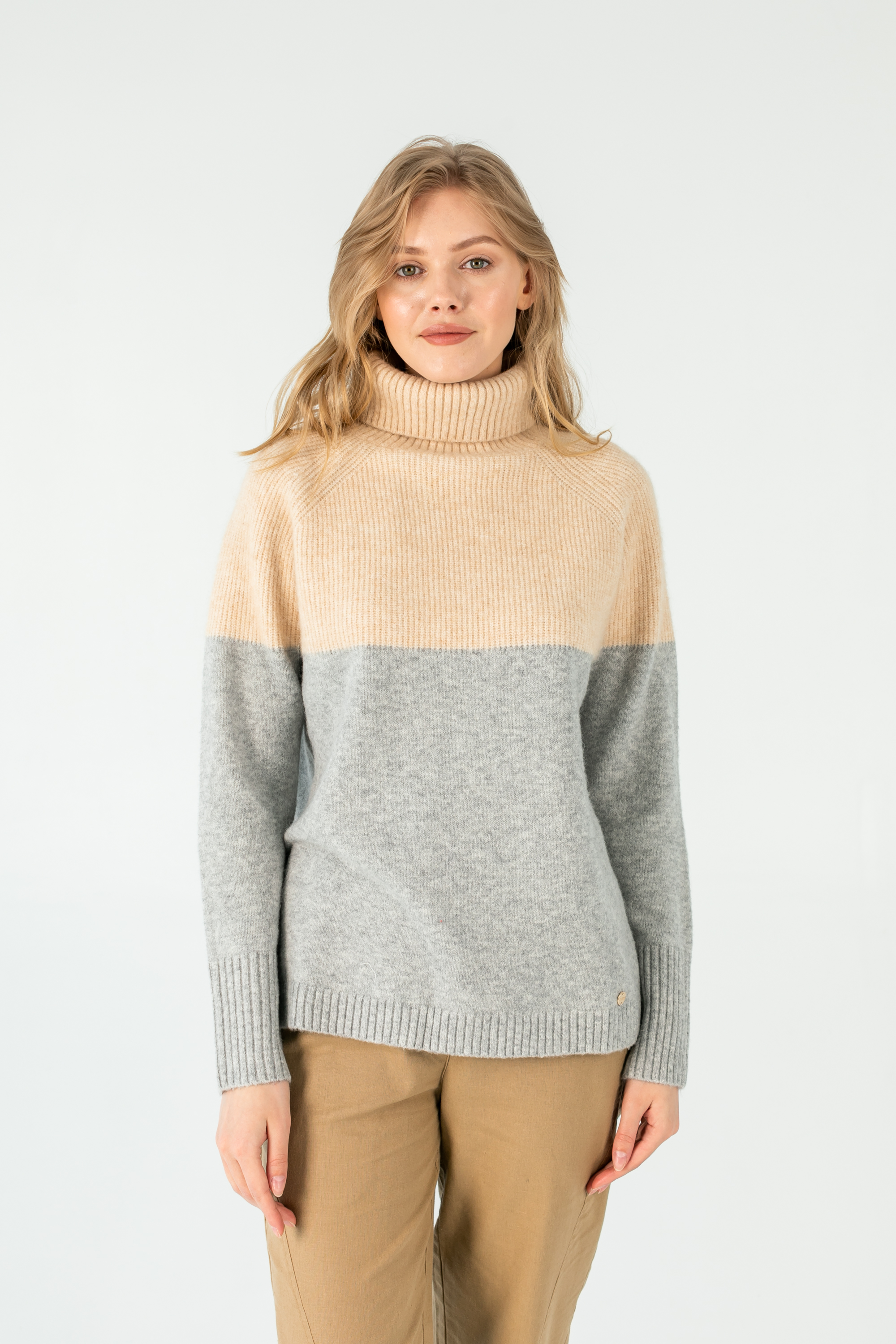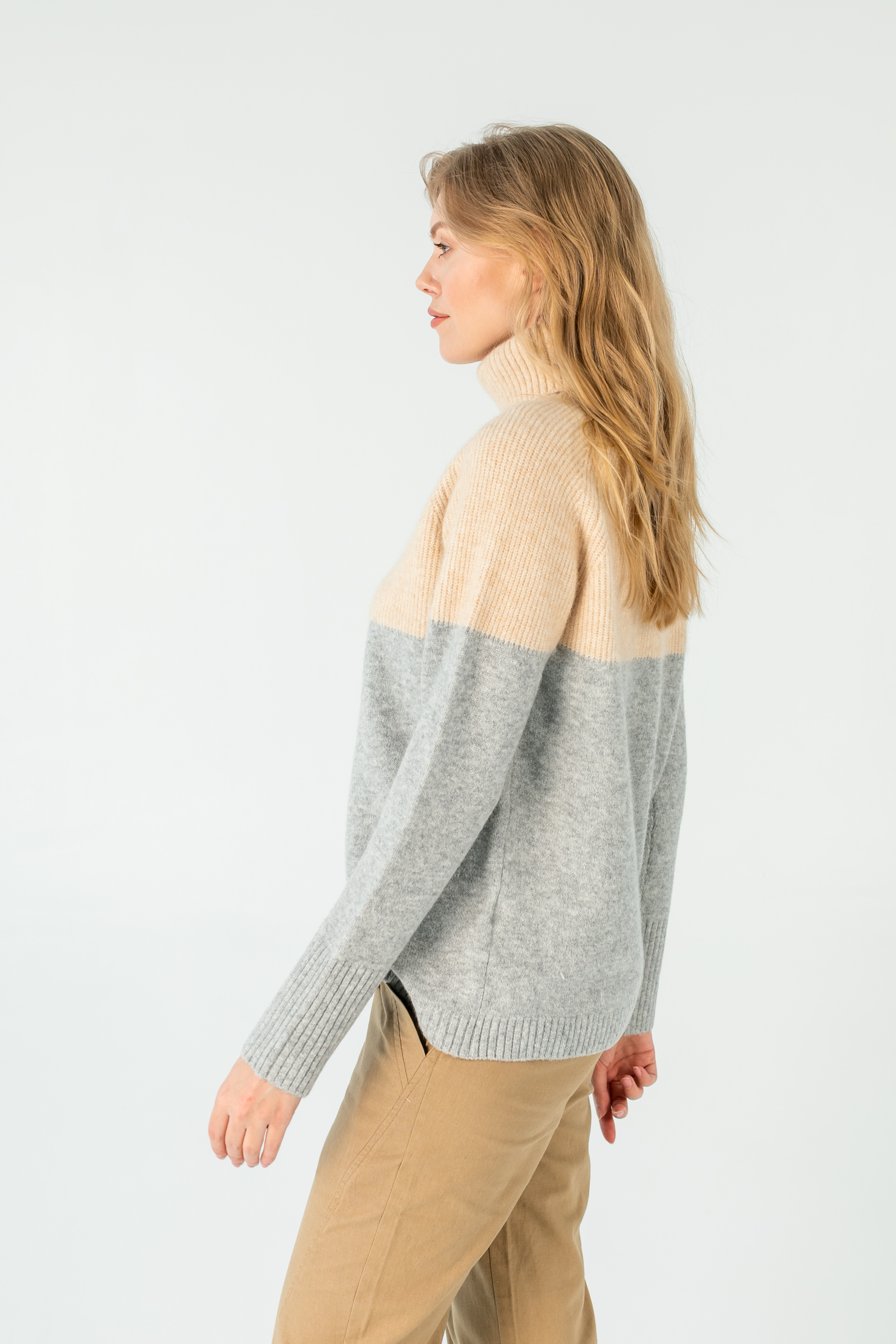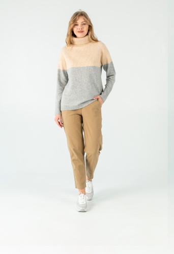 На сайте представлены российские размеры. Ткань: 13% мохер, 35% шерсть, 49% нейлон, 3% эластан. Крой: джемпер с прямого силуэта с высоким воротом-резинкой, надежно защищающим от ветра и холода. Плотный материал с шерстью и мохером отлично держит форму, что позволяет скрывать возможные несовершенства фигуры, не акцентируя на них внимание. Отделка: джемпер выделяется сочетанием двух цветов и фактур в разных частях изделия: бежевый верх – в рубчик, серый низ – гладкой вязки. Сочетайте со спокойным низом в одном цветовой гамме. Бежевые и серые модели брюк вы можете найти в соответствующем разделе на сайте. Рост модели 177 см