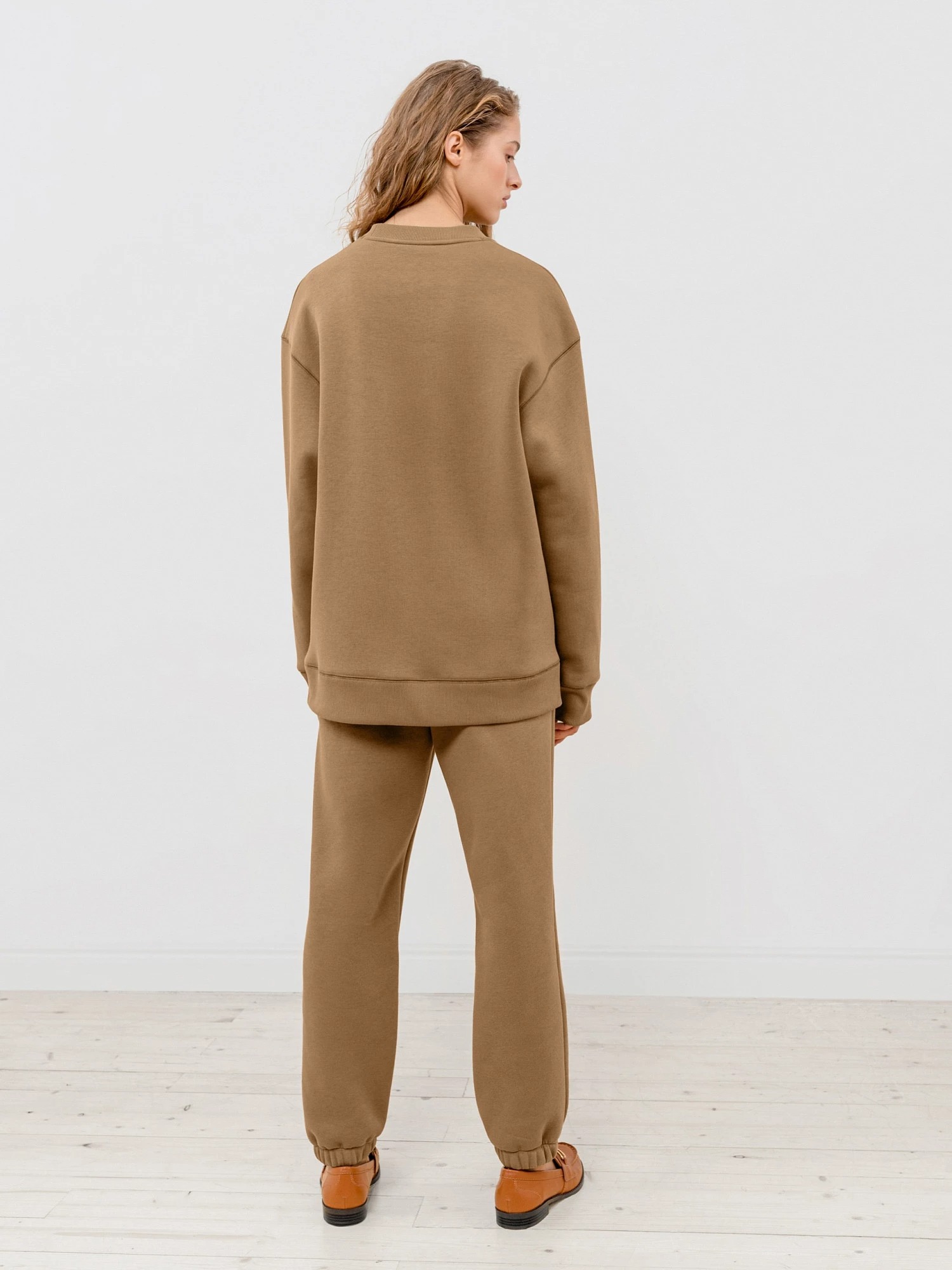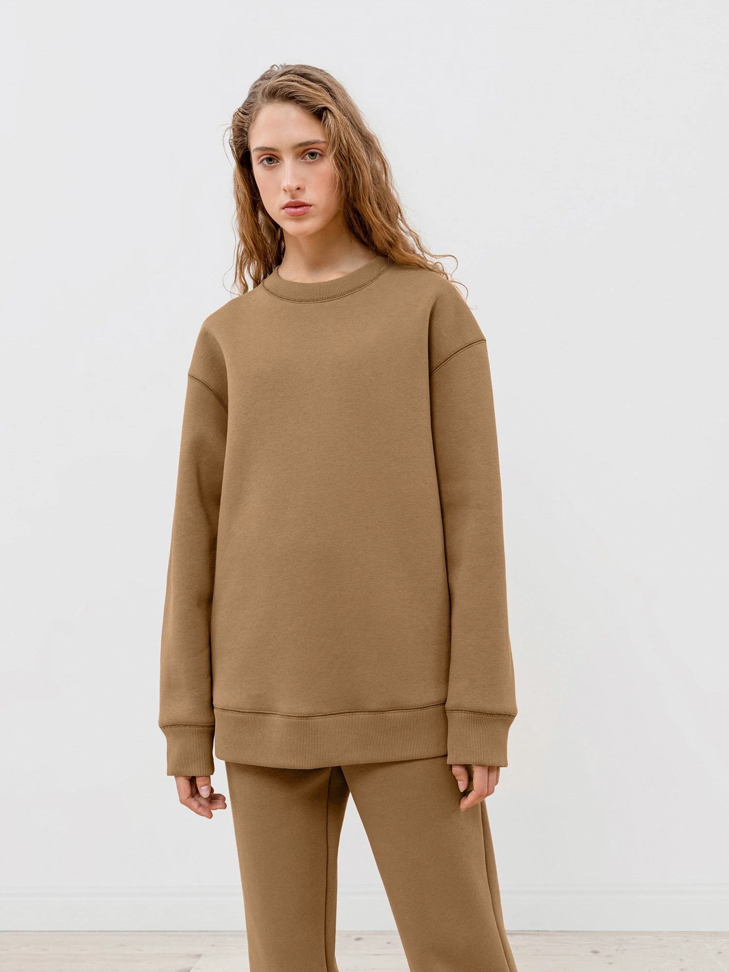 На сайте указаны российские размеры. Свитшот женский прямого силуэта из трикотажного полотна орехового цвета с круглым вырезом горловины, спущенным плечом и рукавом полной длины. Вырез горловины, низ рукавов и низ изделия обработаны кашкорсе в цвет основной ткани. Рост модели на фото - 175 см.