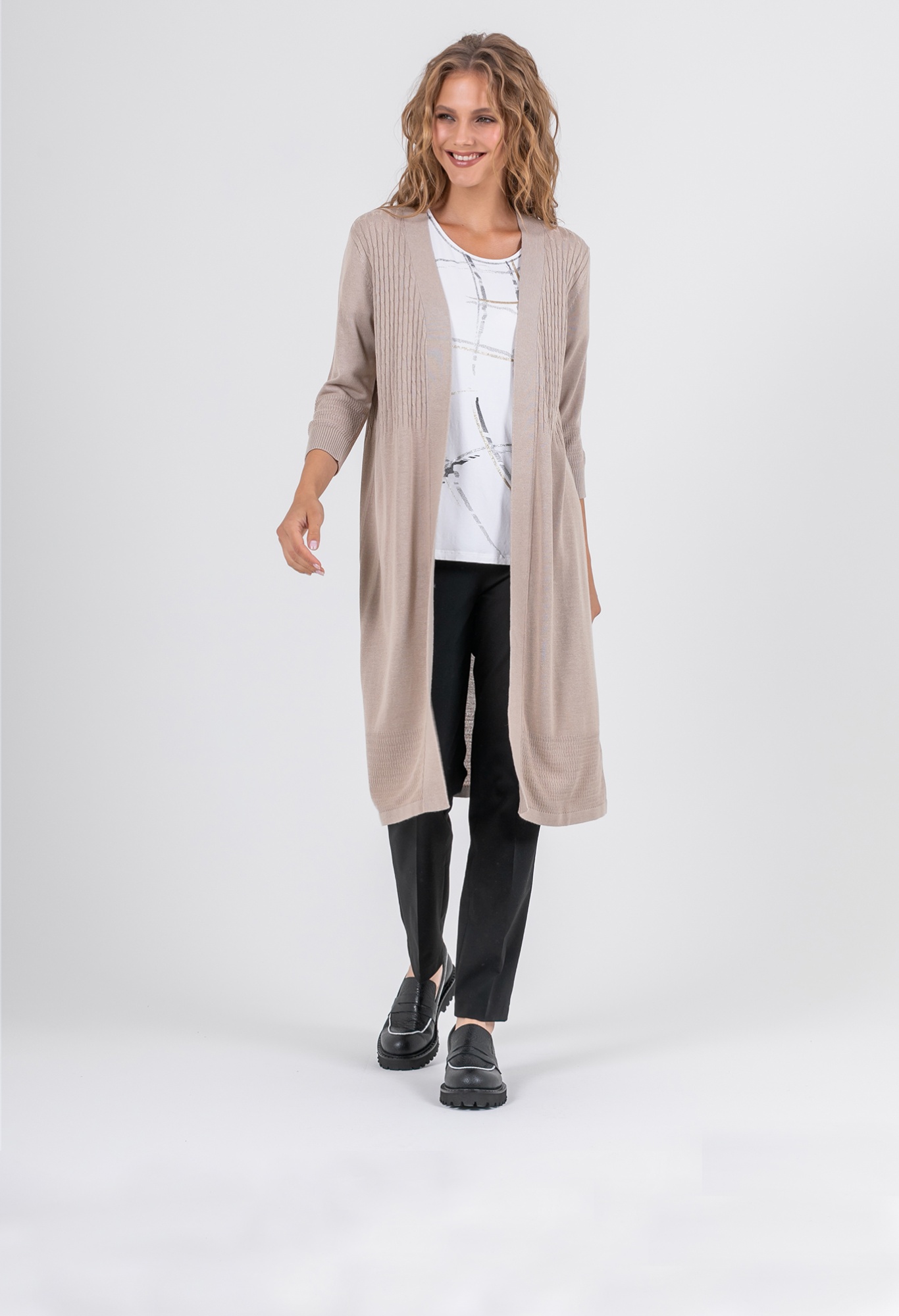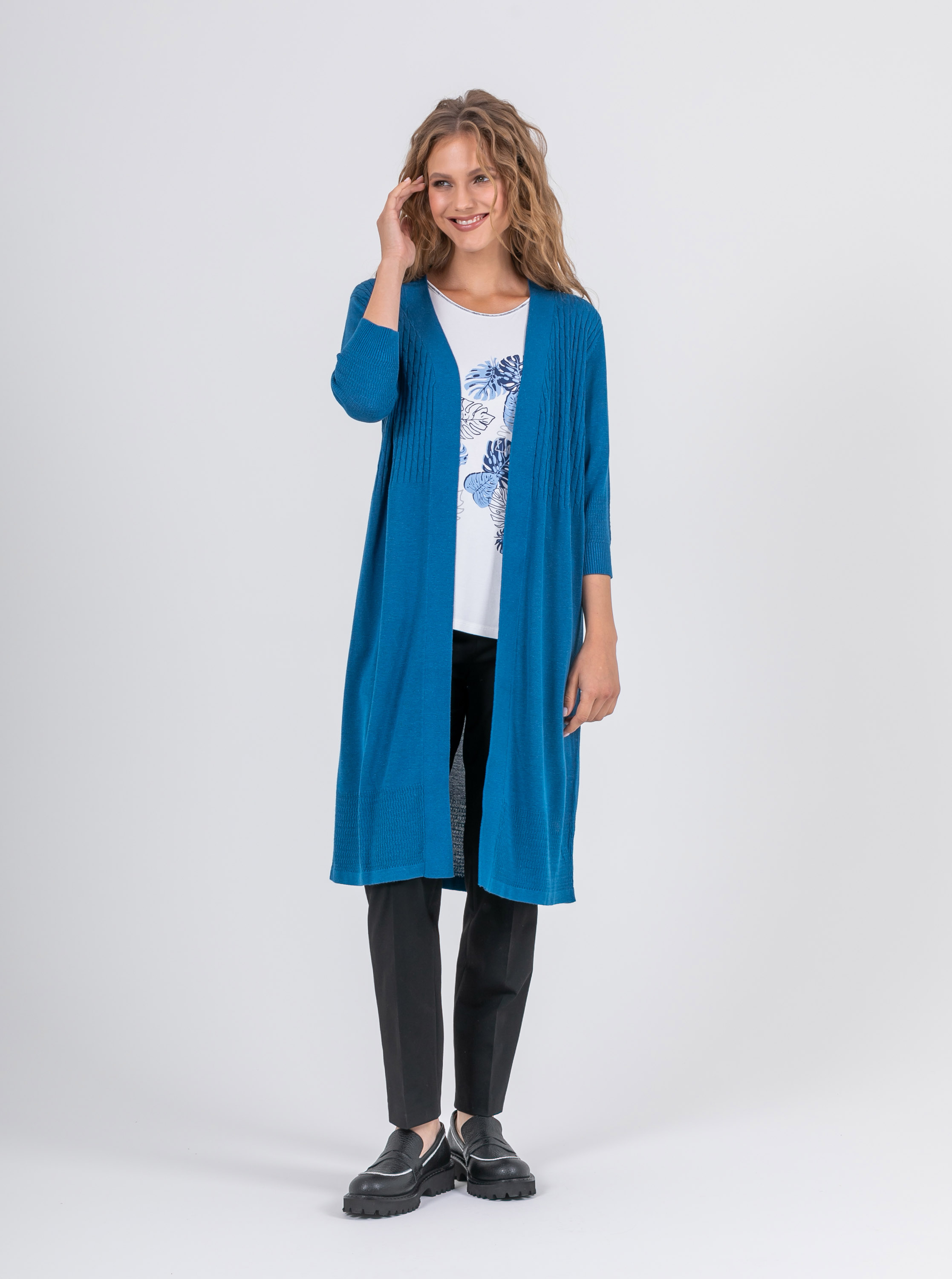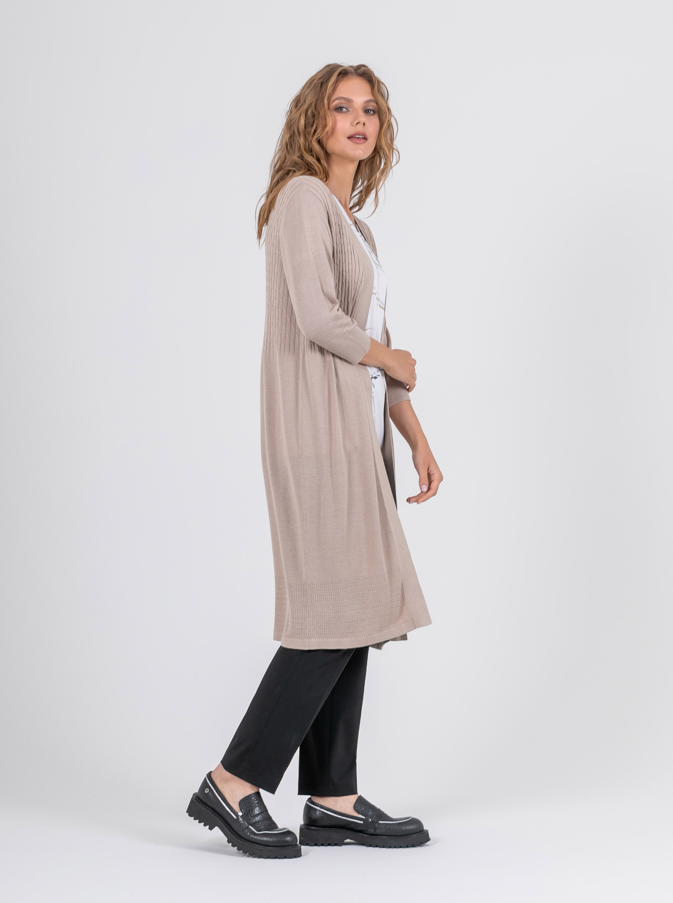 На сайте указаны российские размеры. Ткань: кардиган из мягкой, приятной телу вискозы с добавлением льна. Материал позволяет создавать красивую драпировку. Крой: прямой удлиненный кардиган с рукавом 3/4 создает идеальную вертикаль, визуально удлиняющую силуэт. Функциональный манжет-резинка позволяет поднять и зафиксировать рукав на нужном уровне. Отделка: кардиган имеет два вида отделки – фактуру «косы» в верхней части и на спинке и фактуру «волна» в нижней части изделия. В верхней части спины присутствует фирменный металлический шильдик-эмблема. Кардиган отлично дополняет футболки, рубашки, блузки, а также брюки, юбки и платья из ассортимента Stern. Рост модели 175 см.
