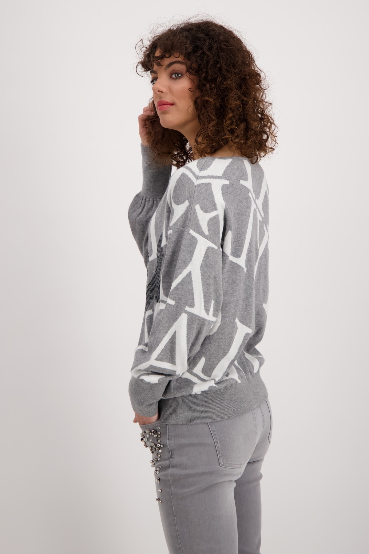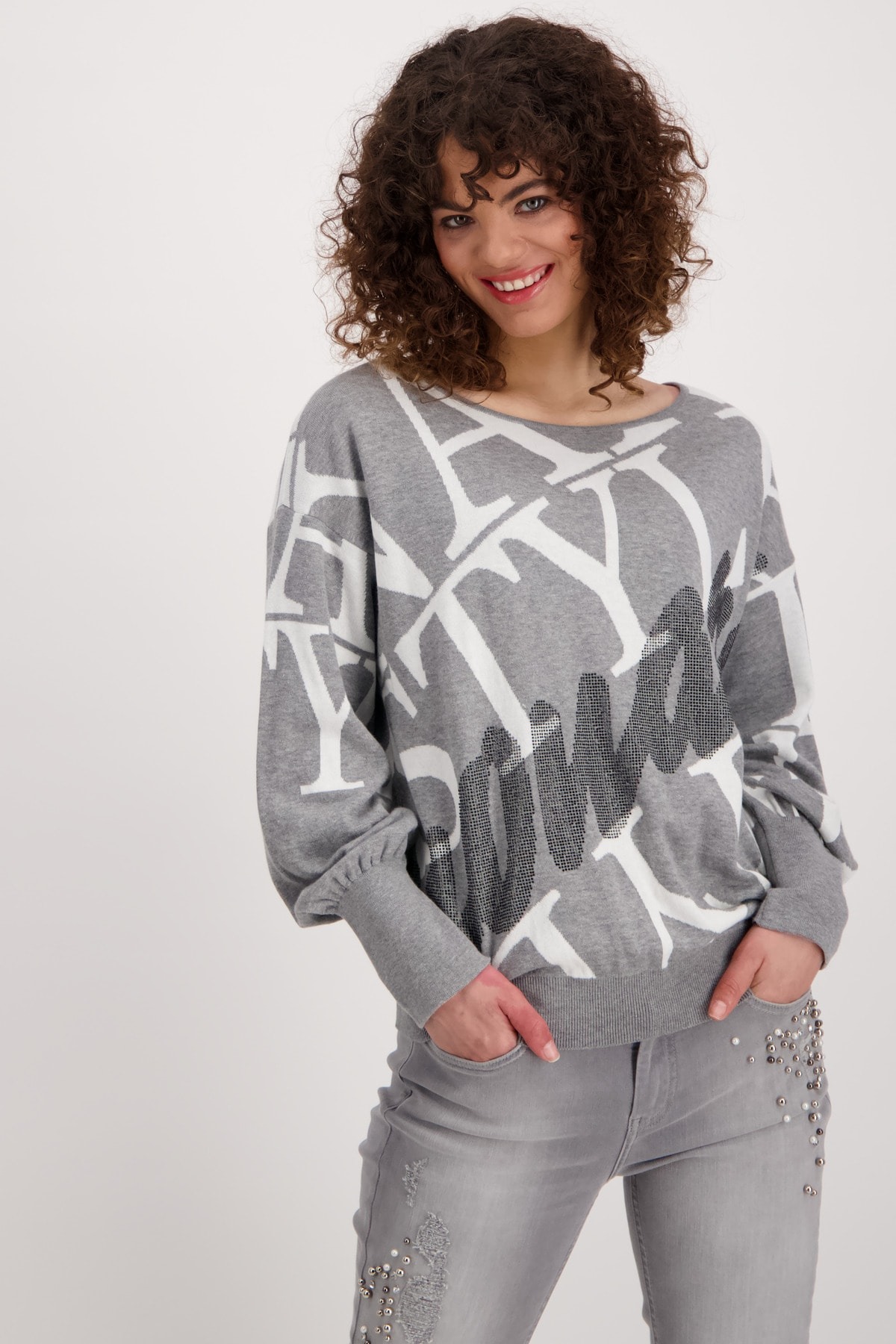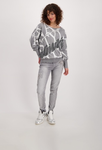 На сайте указаны российские размеры. Пуловер прямого кроя с круглым вырезом, широкой резинкой по низу и приятного качества из высококачественной смеси хлопка и полиамида для удобной посадки. Сплошной жаккард с надписями прерывается крупной надписью из страз в тон спереди и становится изюминкой дизайна. С гламурными джинсами облегающего кроя с драгоценными камнями для повседневного образа. Модель ростом 174 см.