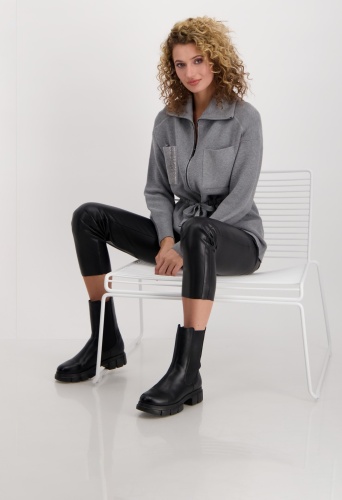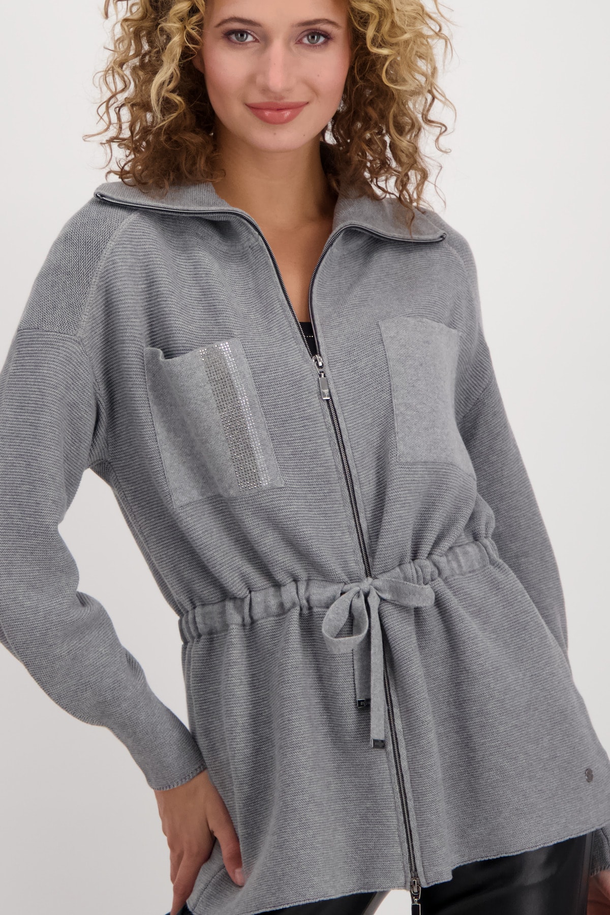 На сайте указаны российские размеры. Блейзер из хлопка с завязками на молнии. Мягкий кардиган от monari имеет модный дизайн изнаночной вязки. Рукава реглан, вставка чулочной вязкой на плечах и прямой крой с воротником-тройе и кулиской с завязками на талии придают модели непринужденный вид. Два накладных кармана с узором лицевой гладью и сверкающими стразами на груди украшают перед. Модель ростом 176 см.