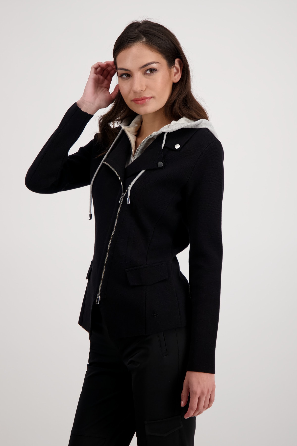 На сайте указаны российские размеры. Вязаный блейзер со съемной вставкой от пота. Классная вставка от пота с капюшоном и молниями уникальным образом украшает ваш образ и без проблем снимается. Аутентичный образ с ложными карманами с клапанами и слегка диагональной двусторонней молнией стильно и по-спортивному дополнен декоративными пуговицами на воротнике с лацканами. Рост модели 179 см.