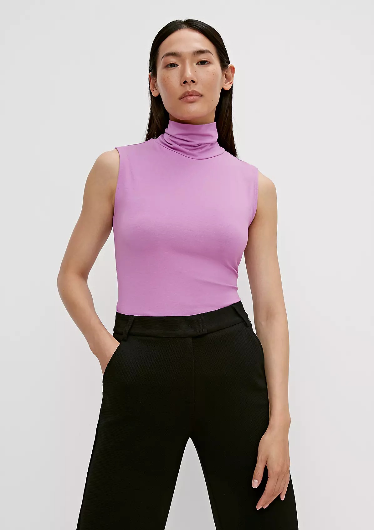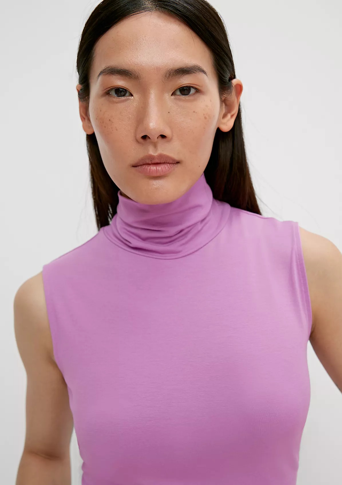 На сайте указаны российские размеры. Приталенный топ без рукавов с воротником-поло. Выполнен из эластичной мягкой ткани. Длина спины: 60 см в размере 42.
