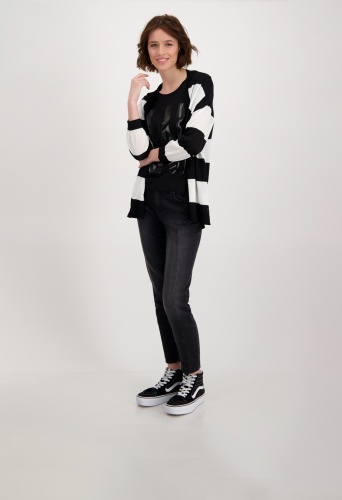 На сайте указаны российские размеры. Открытый кардиган с рукавом 3/4 и деталью на спине. Кардиган с открытым передом придает вашему образу великолепный вид и идеально подходит для комбинирования. Прямой фасон дополнен манжетами и рюшами на концах рукавов, боковыми разрезами и низом с манжетами в резинку. Вывязанная буква со сверкающими стразами украшает спину модели, украшенной полосками по всей поверхности. Струящаяся вискоза в смеси также обеспечивает удобную посадку. Побалуйте себя. Модель ростом 178 см Длина спины 72 см.
