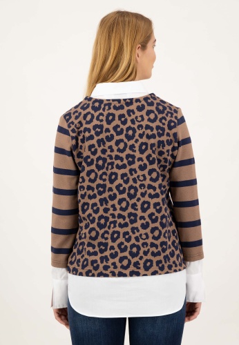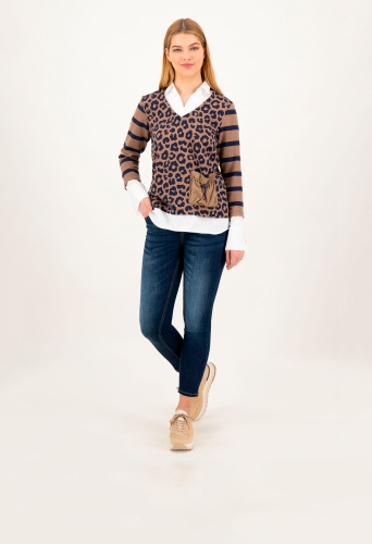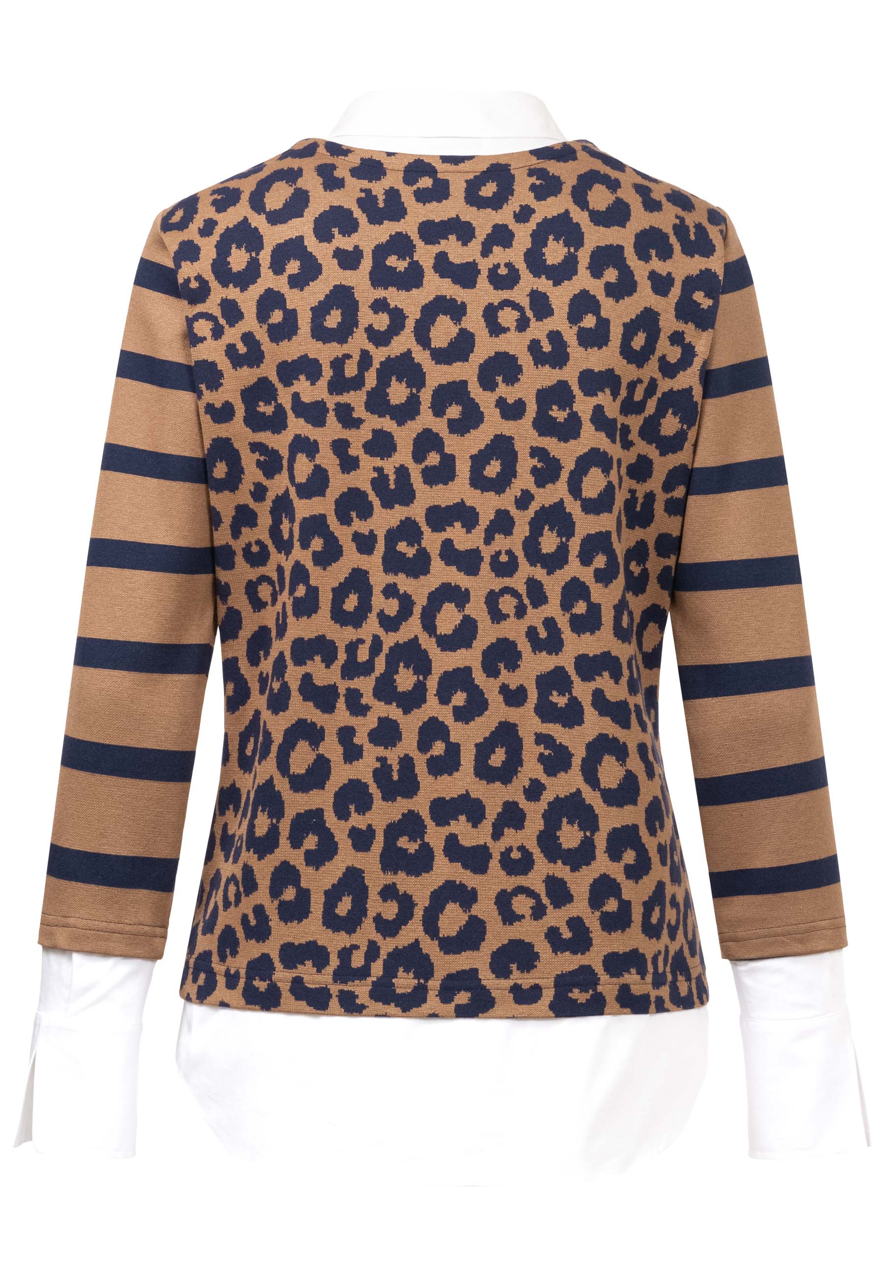 На сайте указаны российские размеры. Свитер с анималистичным принтом и блузочной вставкой. Несложная модель «два в одном» для модного стиля. Будь то в офисе для модного делового образа или для непринужденного повседневного образа в повседневной жизни - с этой модной вещью вы всегда будете одеты идеально. Блузочная вставка с воротником-стойкой, широкие манжеты с прорезями и удлиненный низ сзади придают пуловеру небрежно-шикарный вид. Наша модель ростом 177 см. Измерения для 44 размера: Окружность груди: 104 см Талия: 101 см Ширина бедер: 110 см Длина спинки: 70 см. Длина рукава: 62 см.