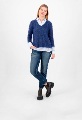 На сайте указаны российские размеры. Уютный свитер с модной блузочной вставкой. Свитер и блузка в одном – так создаются спортивные, незамысловатые наряды. Наряд два в одном, состоящий из уютного свитера и полосатой блузки со вставками, идеален для повседневного образа. Классические элементы блузки, такие как воротник рубашки и манжеты с прорезями, которые можно небрежно вывернуть наизнанку, также придают этой блузке оригинальный деловой вид для повседневного использования в офисе. Наша модель ростом 177 см. Измерения для 44 размера: Окружность груди: 104 см Талия: 101 см Ширина бедер: 110 см Длина спинки: 70 см. Длина рукава: 62 см.