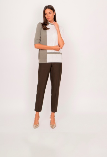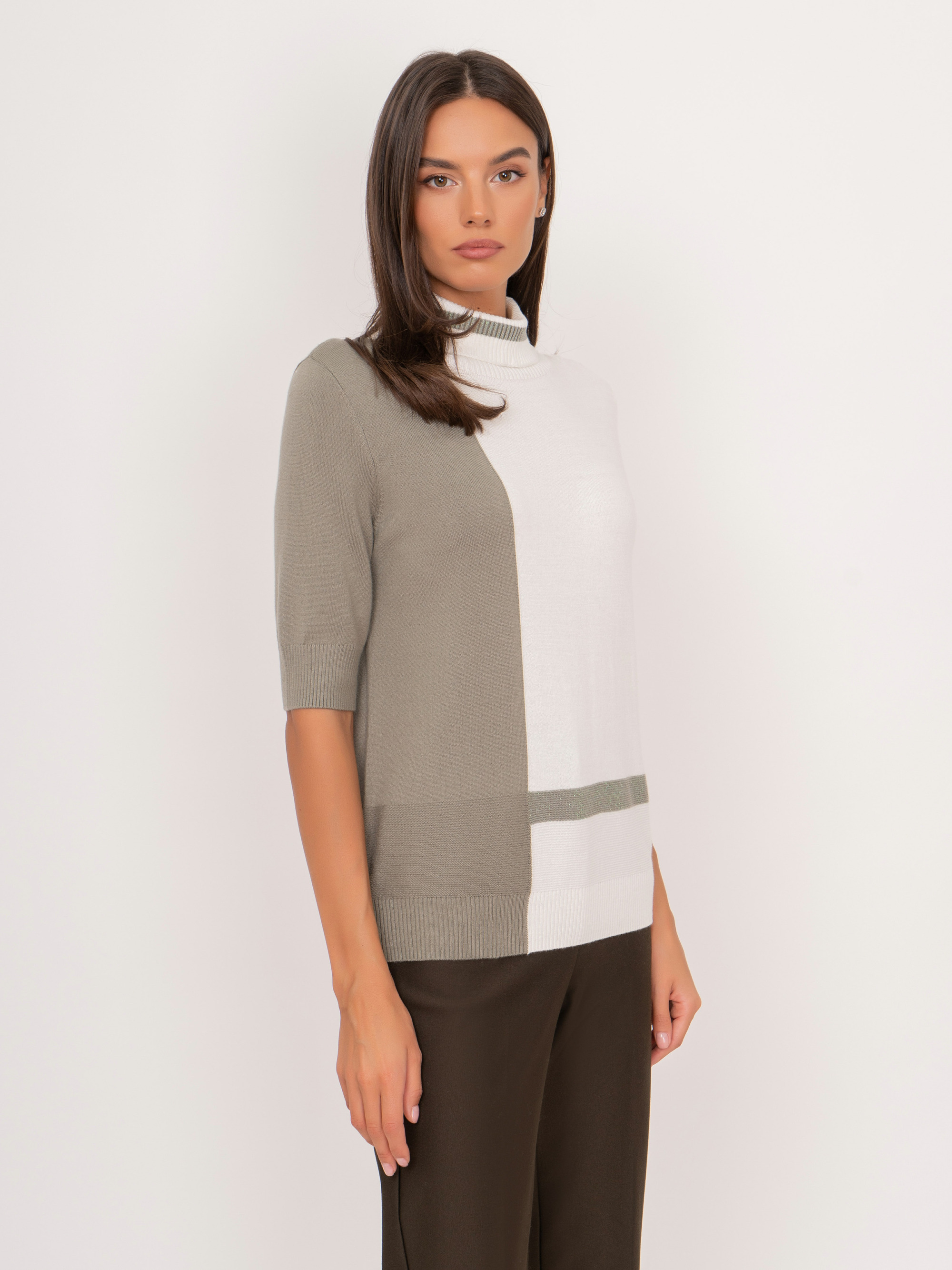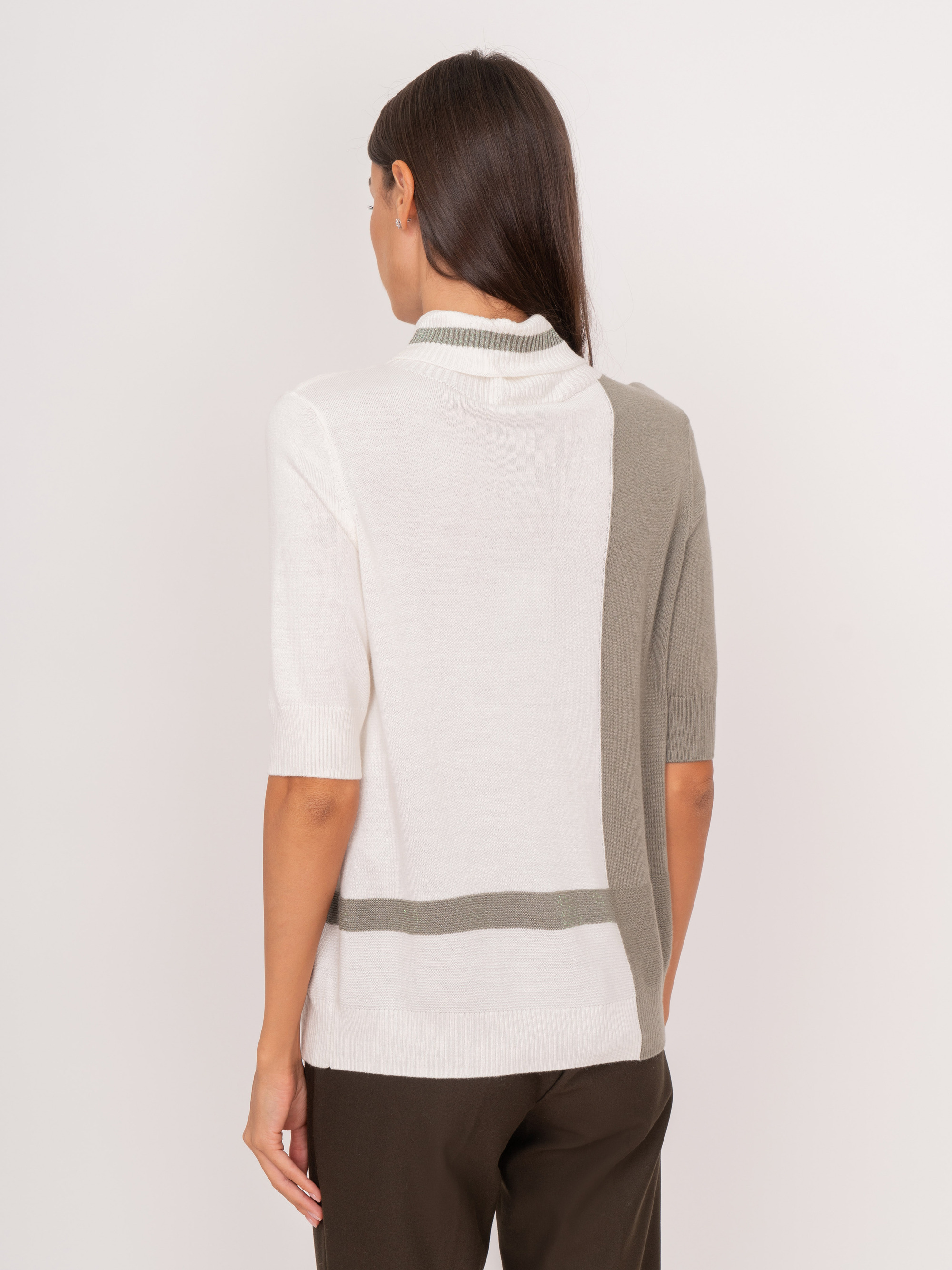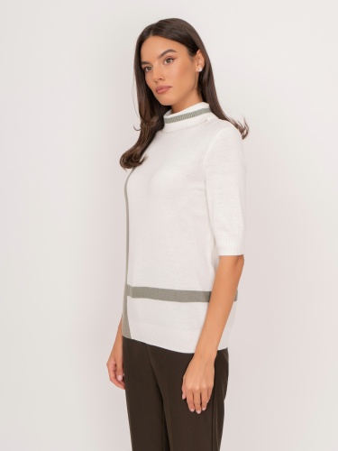 На сайте указаны российские размеры. Трикотажный полуприлегающий белый джемпер с воротником воронка, с коротким 1/2 рукавом, с хаки вставками и полоской. Рост модели: 175 см. Длина джемпера: 57 см.