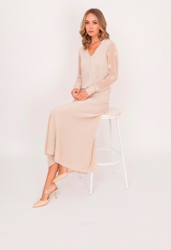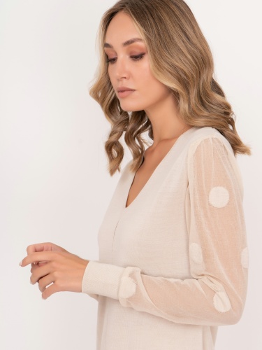 На сайте указаны российские размеры. Прямой трикотажный светло-бежевый джемпер с V-образным вырезом, с длинным прозрачным рукавом в крупный горох, с акцентной полосой по центру. Рост модели: 175 см. Длина джемпера: 60 см.